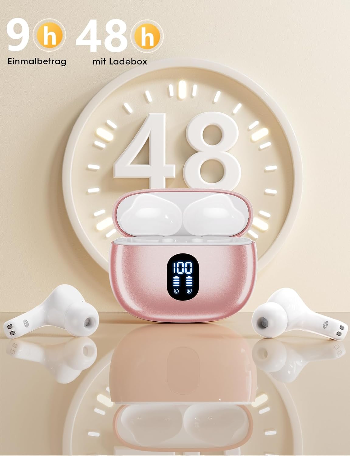• Маратонска мощност: нашите безжични слушалки ви предлагат маратонска мощност до 48 часа общо време за възпроизвеждане със зареждащия калъф. Мини калъфът има цифров LED дисплей (0-100%), а самите слушалки издържат 6-8 часа след бързо зареждане чрез Type-C - идеални за пътуване и дълги дни.