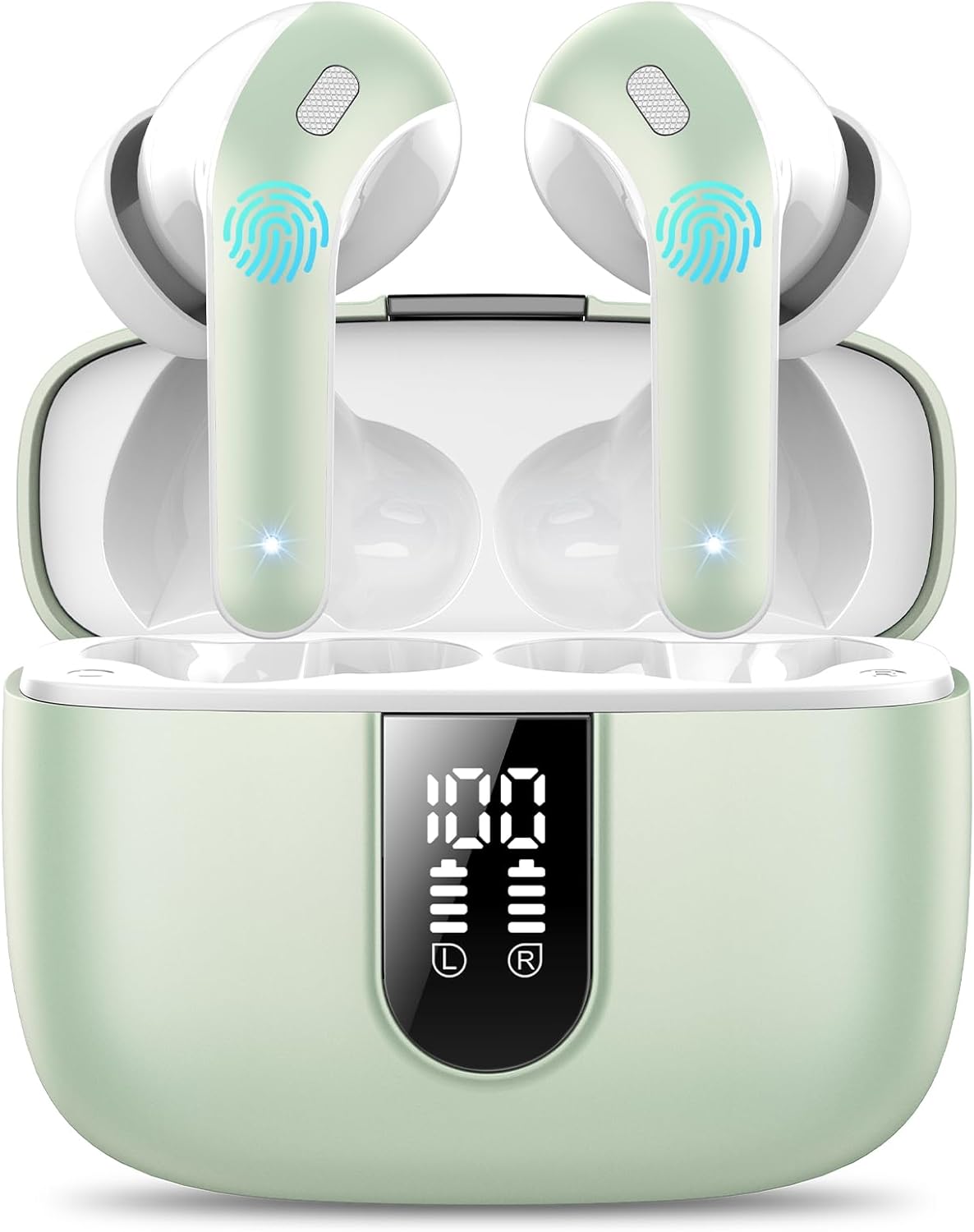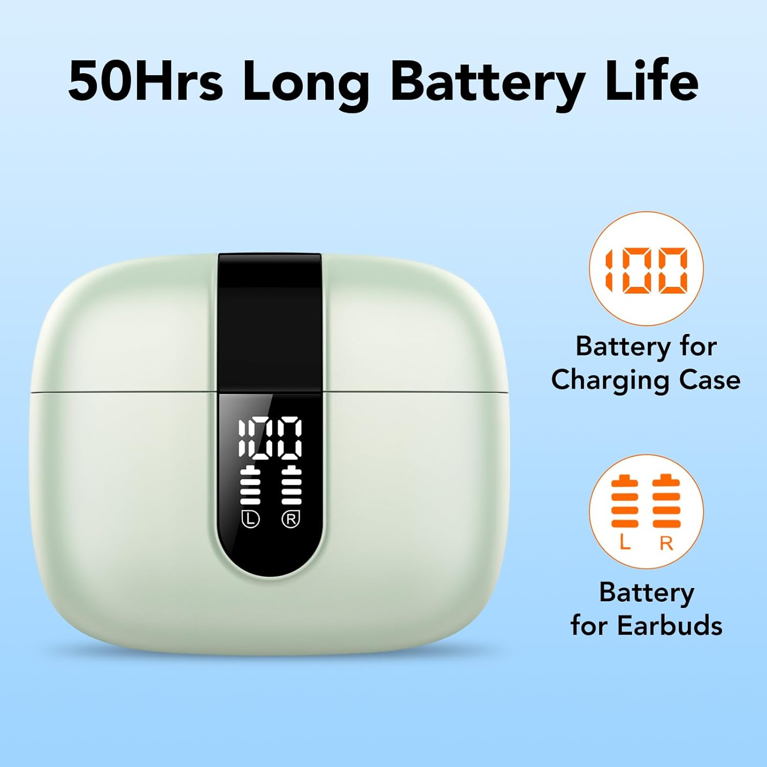 Bluetooth слушалки, Безжични слушалки за уши Bluetooth 5.3 с 50H дълбок бас, Нови безжични слушалки от 2024 г. с шумопотискане и 4 ENC микрофона, Водоустойчиви слушалки IP7, Ментово зелени