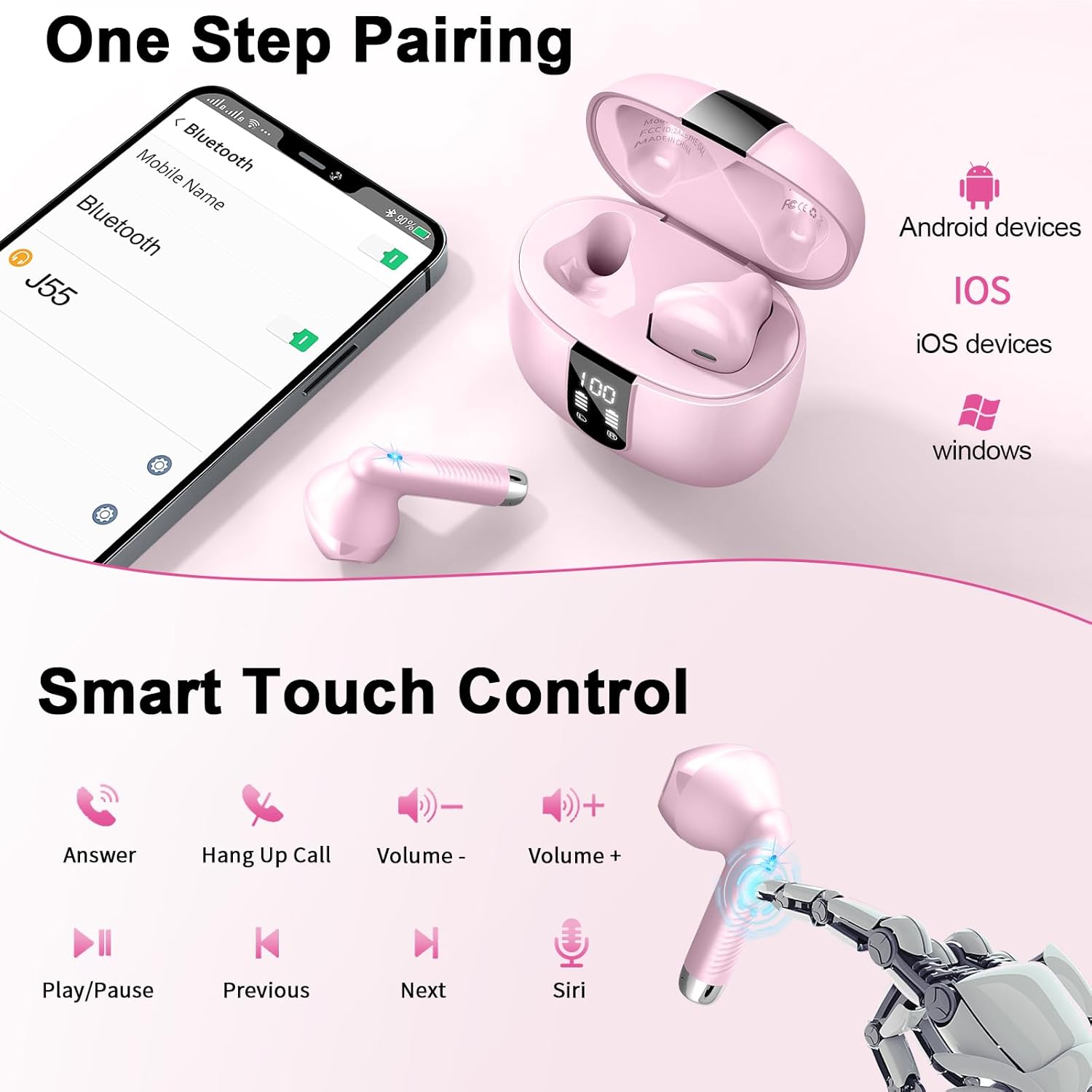 • Универсална съвместимост и сензорно управление: Bluetooth слушалките могат лесно да се сдвоят с всички Bluetooth устройства. С интелигентен дизайн на сензорното управление, няма натиск при докосване, лесни за употреба. Точната позиция за докосване на слушалките в ушите е разположена в горната част на повърхността на слушалките. Просто докоснете за бърз достъп до всички функции, възпроизвеждане/пауза на музика, сила на звука +/-, поддръжка на Siri, включване/изключване, повиквания и др.