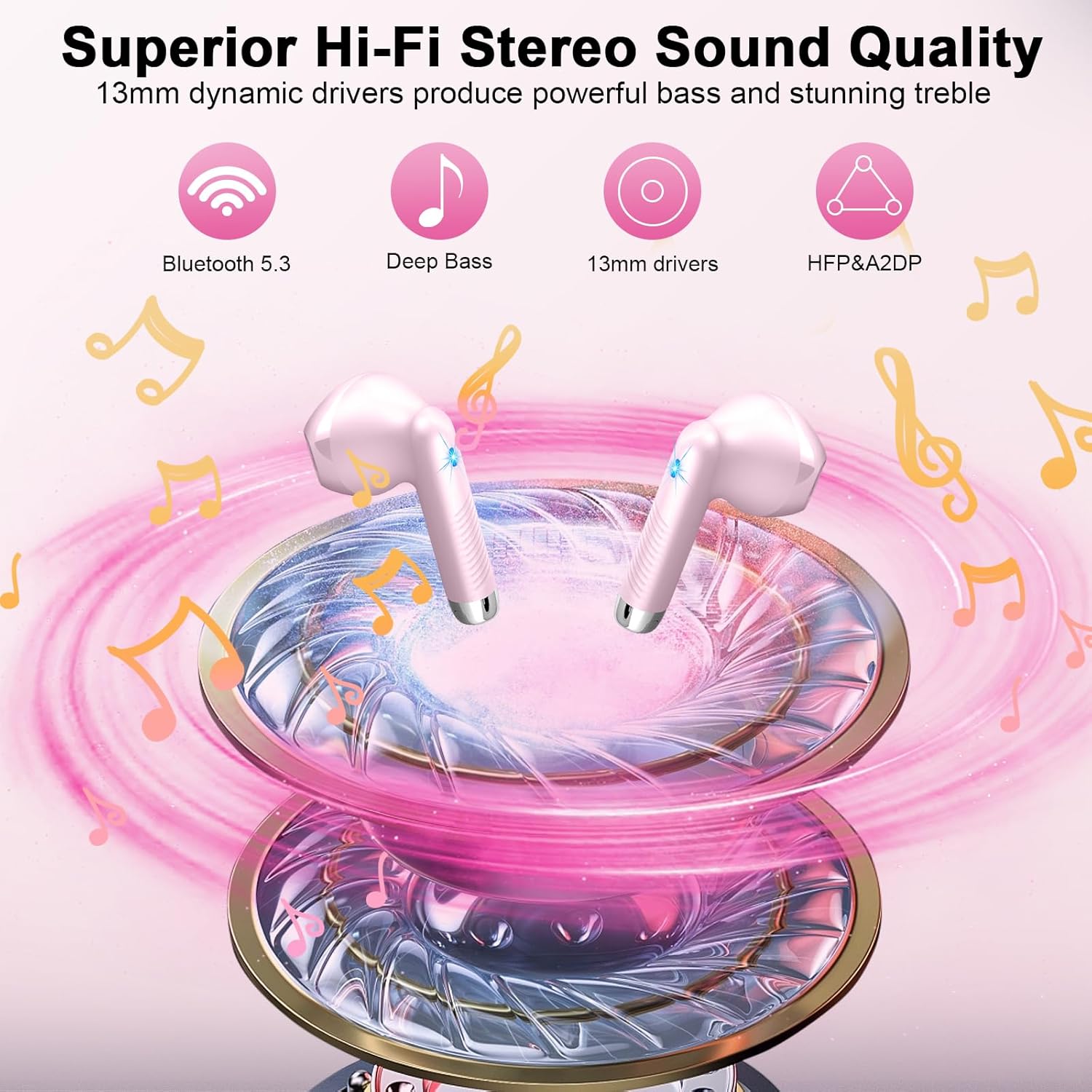 • Bluetooth 5.3 и незабавна връзка: безжичните Bluetooth слушалки са оборудвани с водеща в класа си технология Bluetooth 5.3, която увеличава скоростта на предаване на аудио данни с до 75% и позволява по-стабилни връзки с по-ниска консумация на енергия (обхватът на предаване е до 15 м). Bluetooth слушалките за уши се свързват автоматично с вашия телефон (1S), когато отворите кутията за зареждане. Спестява време за чакане.