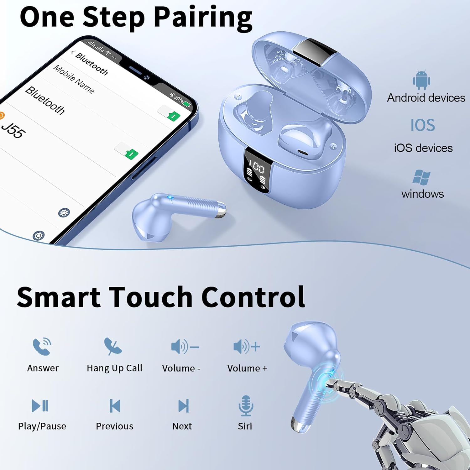 • Универсална съвместимост и сензорно управление: Bluetooth слушалките могат лесно да се сдвоят с всички Bluetooth устройства. С интелигентен дизайн на сензорното управление, няма натиск при докосване, лесни за употреба. Точната позиция за докосване на слушалките в ушите е разположена в горната част на повърхността на слушалките. Просто докоснете за бърз достъп до всички функции, възпроизвеждане/пауза на музика, сила на звука +/-, поддръжка на Siri, включване/изключване, повиквания и др.