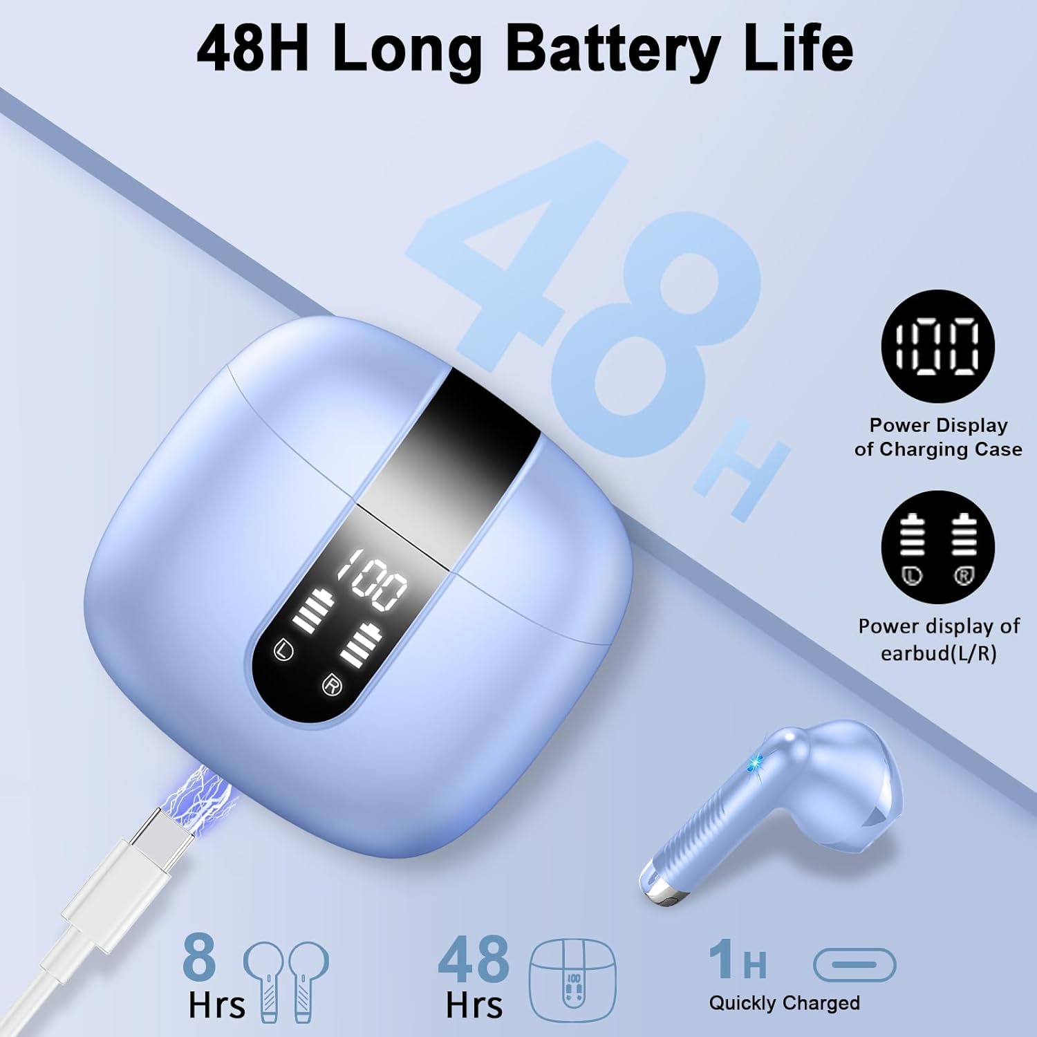 • Мини LED калъф за зареждане и 48 часа живот на батерията: Bluetooth слушалките за уши са оборудвани с интелигентен цифров LED дисплей, който може точно да показва оставащата батерия в цифров формат. След бързо зареждане чрез Type-C можете да слушате музика в продължение на цели 6-8 часа с тези слушалки за уши, докато калъфът за зареждане удължава времето до 48 часа. Джобният калъф за зареждане не заема допълнително място и може да се носи навсякъде.