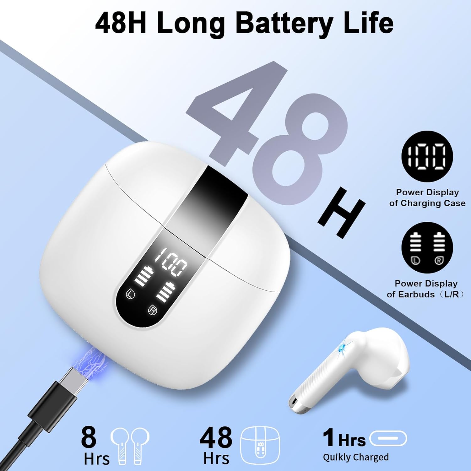 • Мини LED калъф за зареждане и 48 часа живот на батерията: Bluetooth слушалките за уши са оборудвани с интелигентен цифров LED дисплей, който може точно да показва оставащата батерия в цифров формат. След бързо зареждане чрез Type-C можете да слушате музика в продължение на цели 6-8 часа с тези слушалки за уши, докато калъфът за зареждане удължава времето до 48 часа. Джобният калъф за зареждане не заема допълнително място и може да се носи навсякъде.