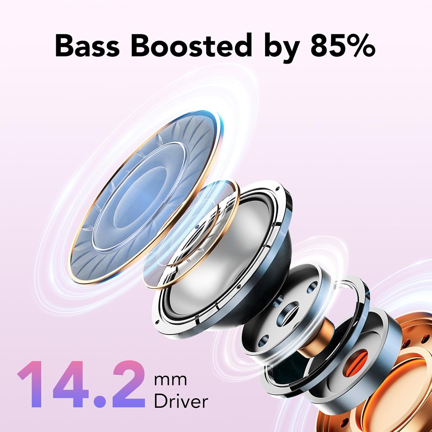 • 85% повече бас и по-ясни разговори: Bluetooth слушалки за уши с 14,2 мм графенова мембрана за 85% повече бас и Bluetooth слушалки за уши с хибриден ENC двоен микрофон, който пасивно потиска 90% от фоновия шум за по-ясни разговори.