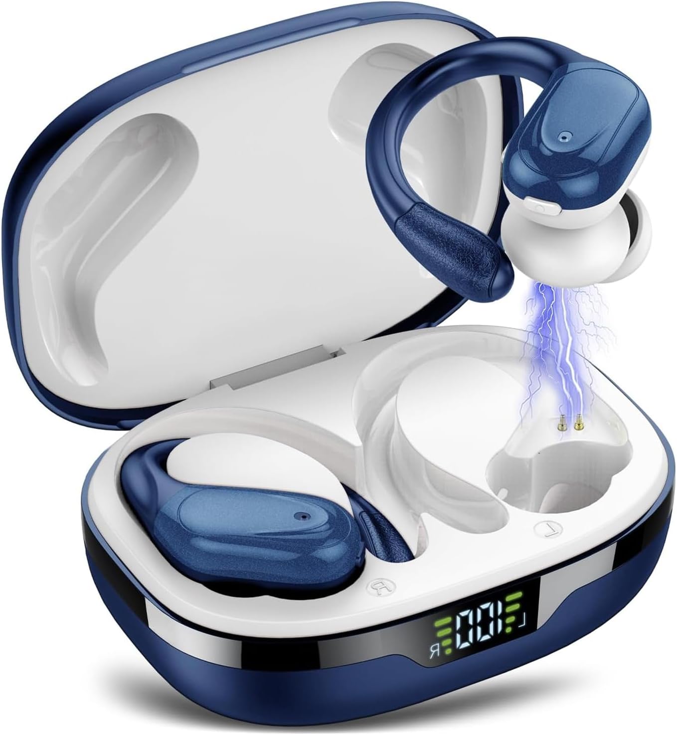 Bluetooth спортни слушалки, безжични Bluetooth 5.3, 60 часа безжични слушалки с дълбок бас, слушалки за уши с 4 ENC Clear Mic, водоустойчиви слушалки IPX7 с кукички за уши, бели/сини