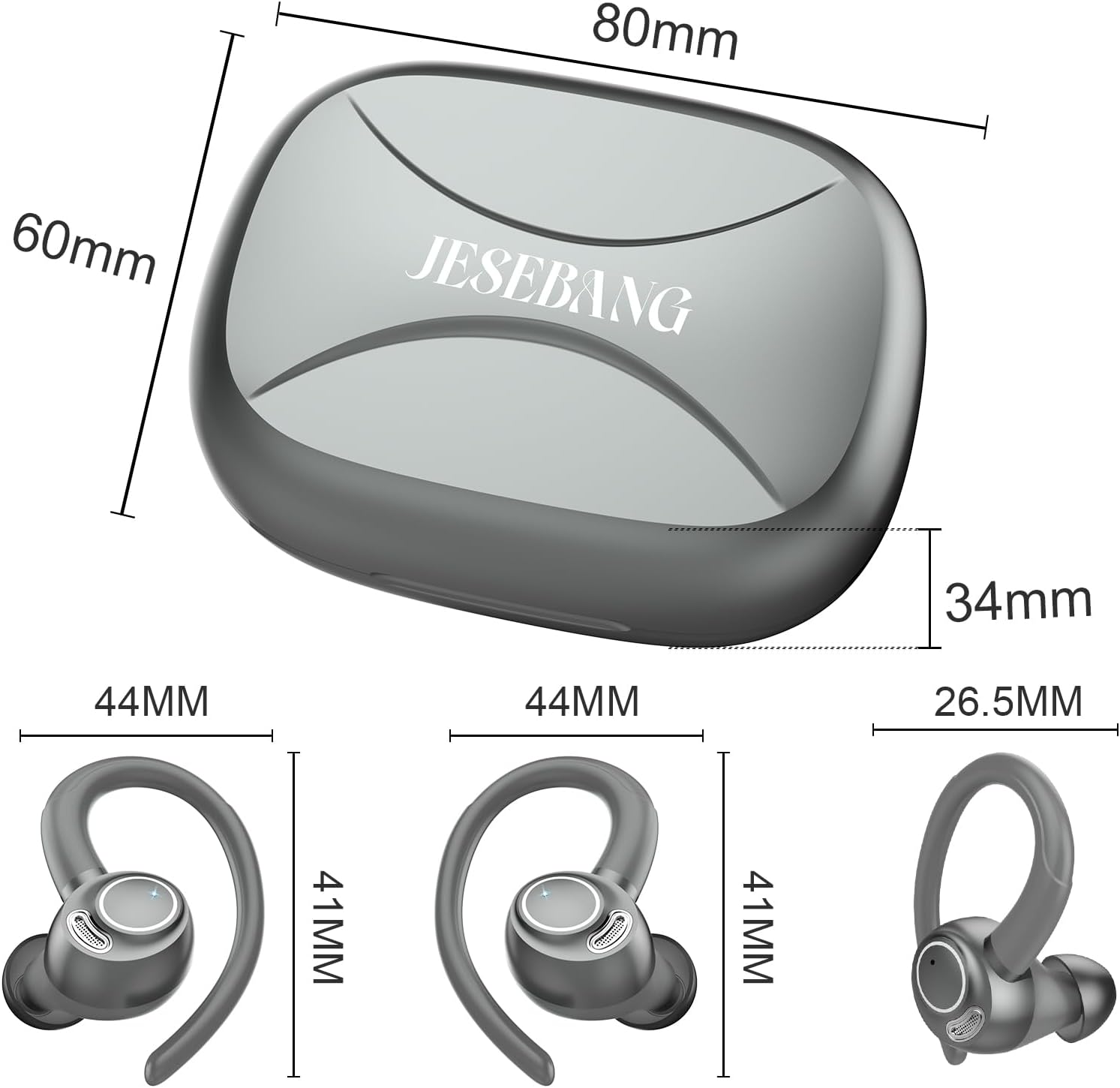 Bluetooth спортни слушалки, слушалки за уши, безжични Bluetooth 5.3 с HD микрофон, изключителен звук, 40 часа време за възпроизвеждане, удобно прилягане, двоен LED дисплей, водоустойчиви слушалки IP7 с кукички за уши, сиви