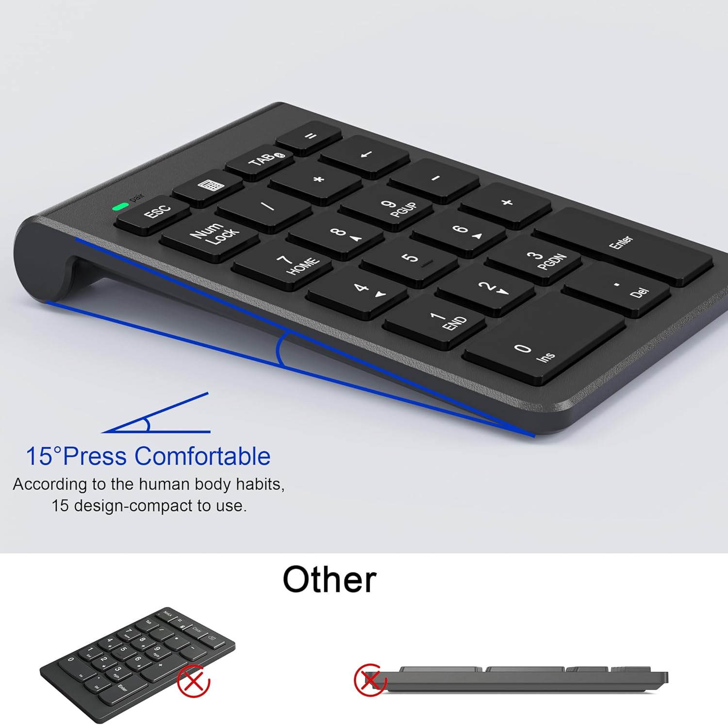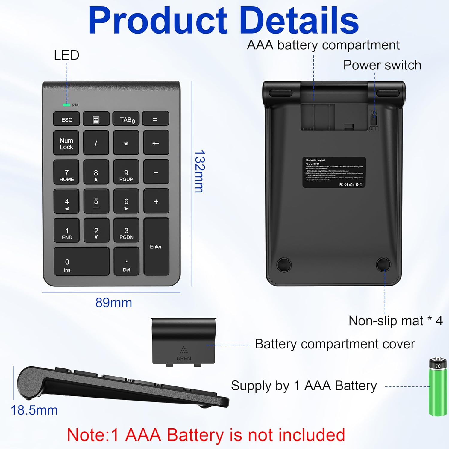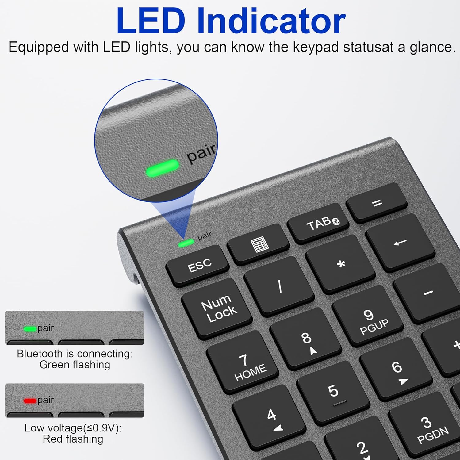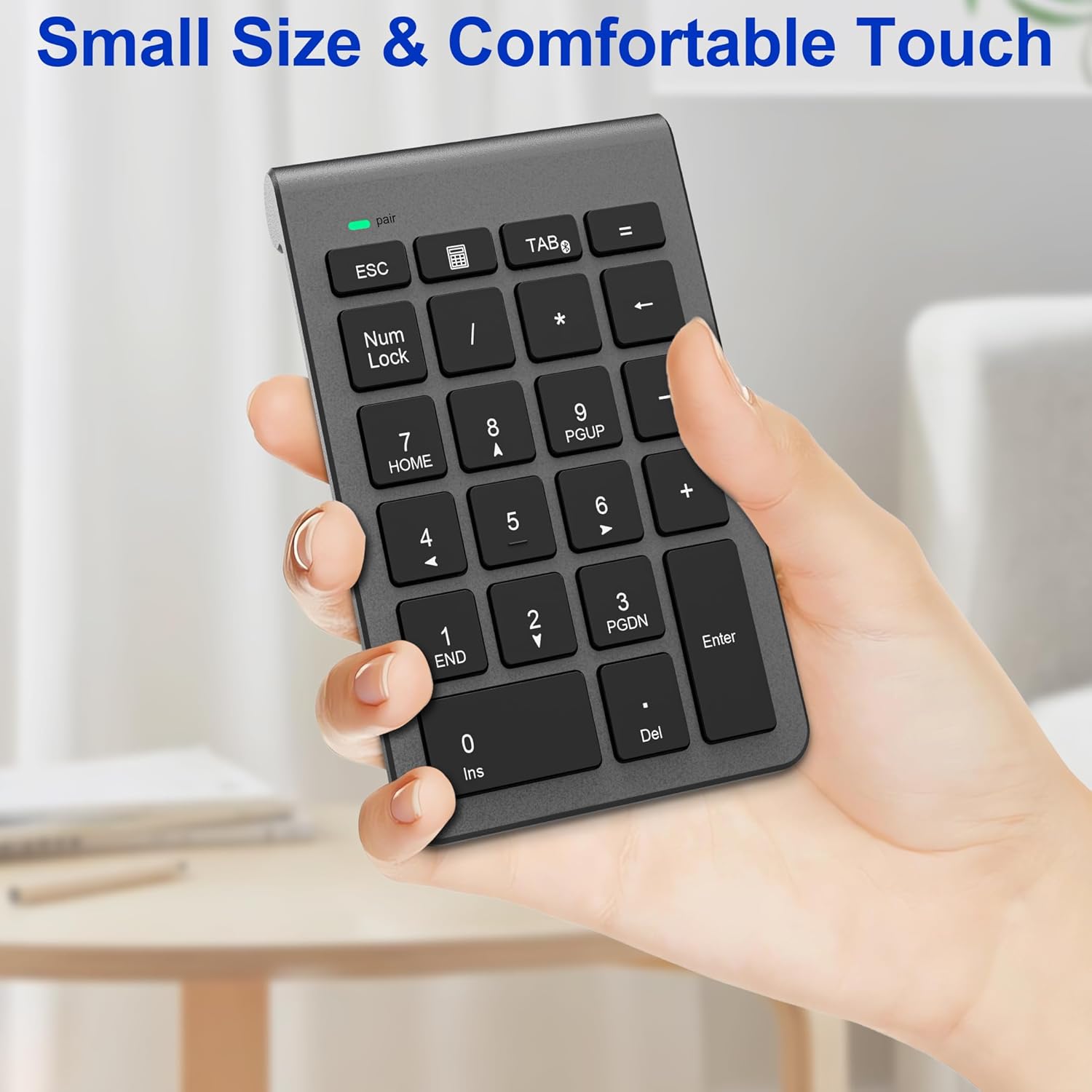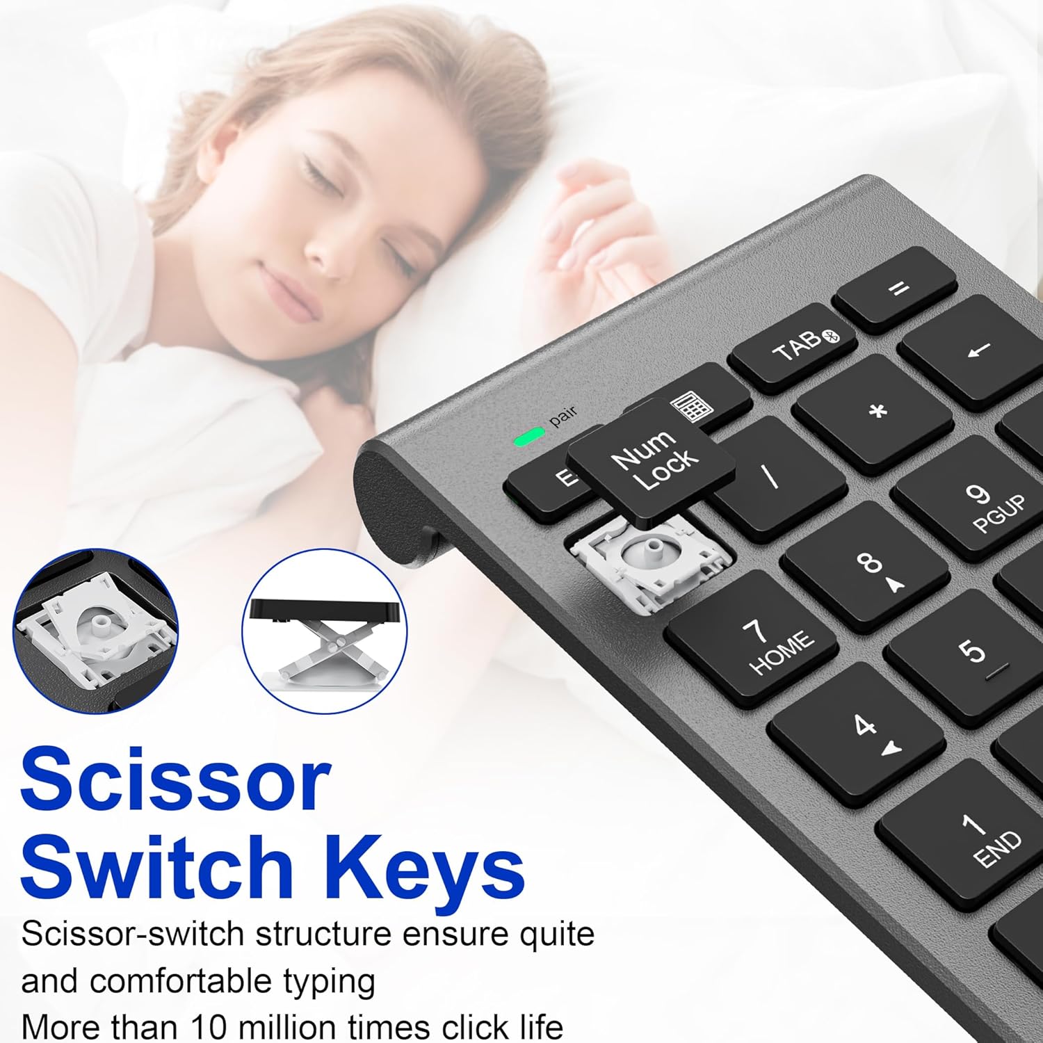 Dual Mode Mastery: With a special switch button, you can immediately switch between data entry via the numeric keypad and the Bluetooth computer. Perfect for Excel warriors and financial experts who need to quickly switch between spreadsheets and calculations. Bluetooth 5.0 + 2.4G wireless freedom: Connect effortlessly to your MacBook, Surface Pro, or PC via dual connectivity. Enjoy the lag-free reach and simultaneous connection of two devices - ideal for crowded desks or hybrid office configurations.Pro-grade 34-key layout: Featuring NumLock, ESC, Delete, 00, and navigation keys (PgUp/PgDn/Insert), this wireless number pad optimizes complex data tasks, while the silent scissor keys deliver pleasant tactile feedback without disturbing colleagues.Update your workspace today: Say goodbye to cramped laptop keyboards and welcome lightning-fast number processing. Whether you're working out budgets, encoding algorithms or matching spreadsheets, our 2-in-1 Bluetooth keyboard is your ticket to precision and efficiency.