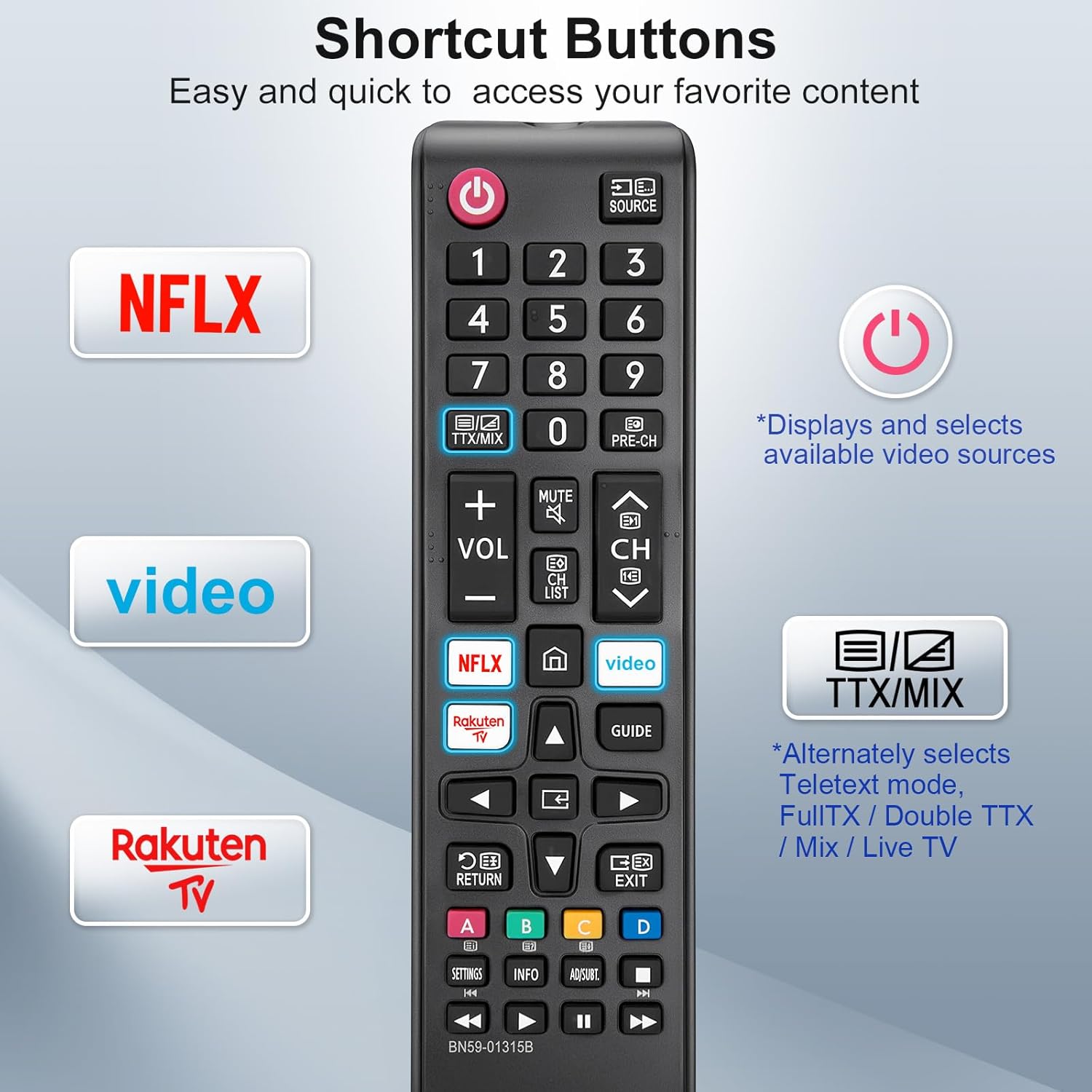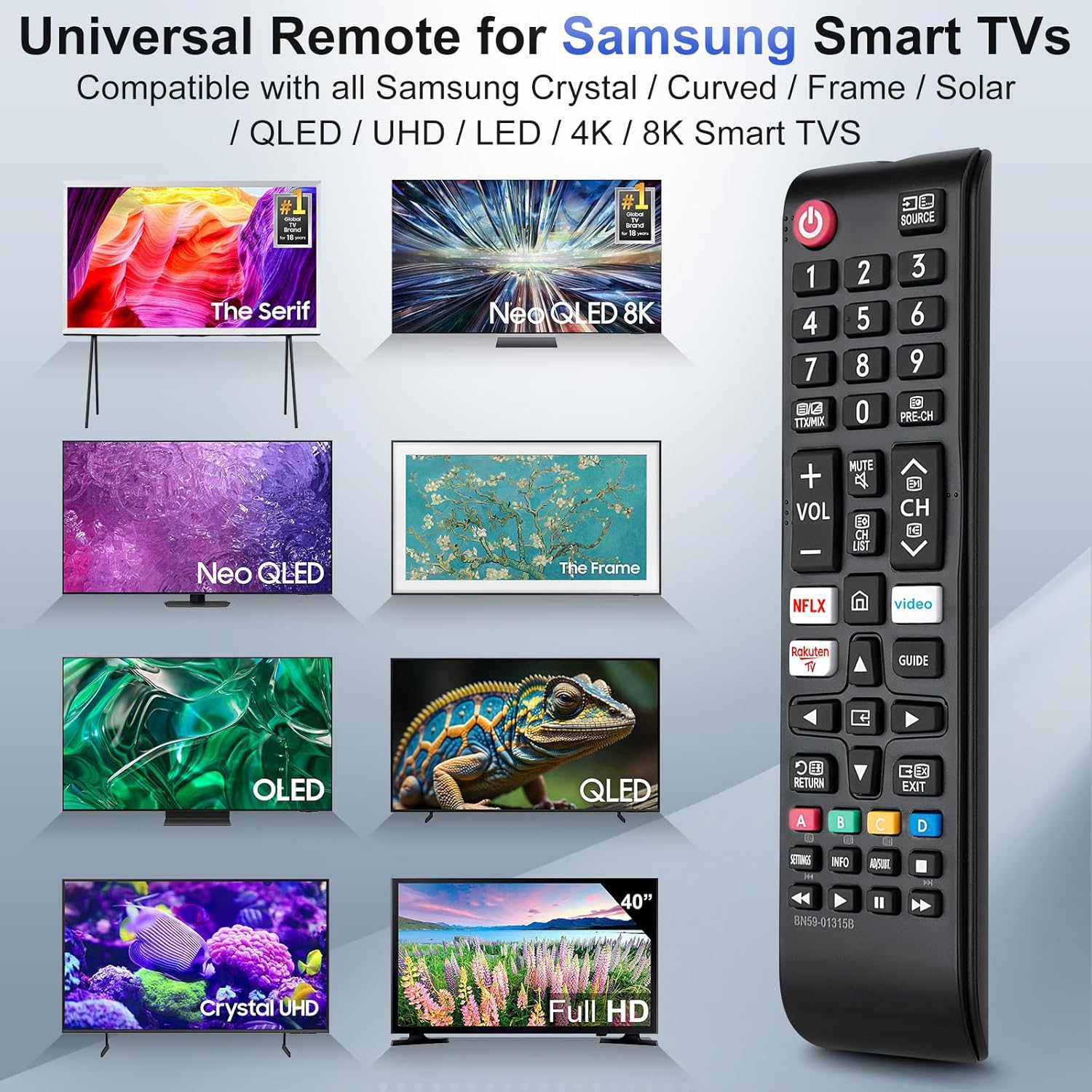 • Универсално дистанционно управление за Samsung Smart TV: Универсалното дистанционно управление за телевизор е съвместимо с всички Samsung Crystal UHD Neo QLED 4K 8K The Frame Smart TV, включително моделите AU9000, AU9007, AU9010, AU9070, BU8000, BU8500, BU8510, Q50A, Q60A, Q65A, Q70, AAQ70B, Q75A, Q75B, Q80A, Q80B, QN700A, QN800B, QN85A, QN85B, QN900A, QN90A, QN90B, QN94C, QN95B, S95B, The Frame Art Mode, телевизори от серията Serif QLED и други.