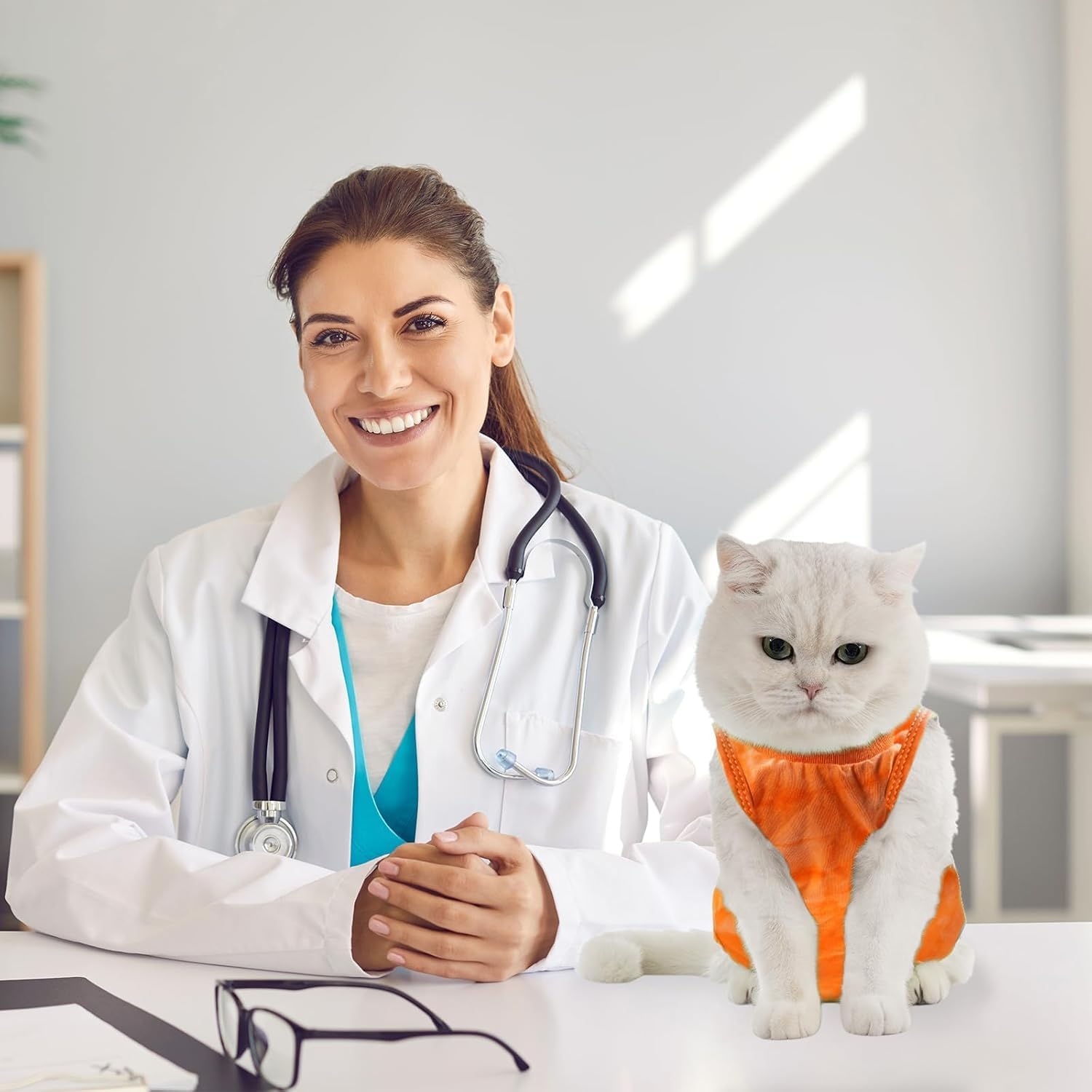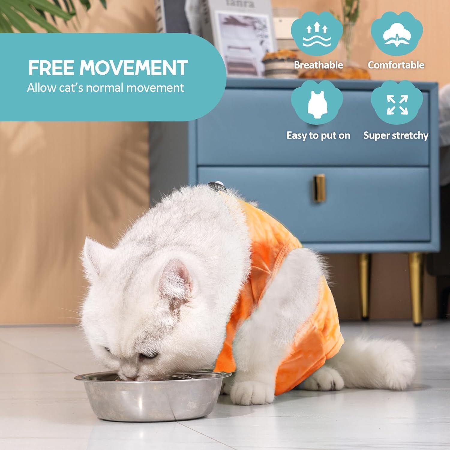 • Дишащ, тънък и мек модален материал. Тънък, мек, еластичен и не пречи на ежедневните дейности на котката. Удобен за носене и насърчава заздравяването и възстановяването. Моля, дайте на котката известно време да се адаптира към носенето му.