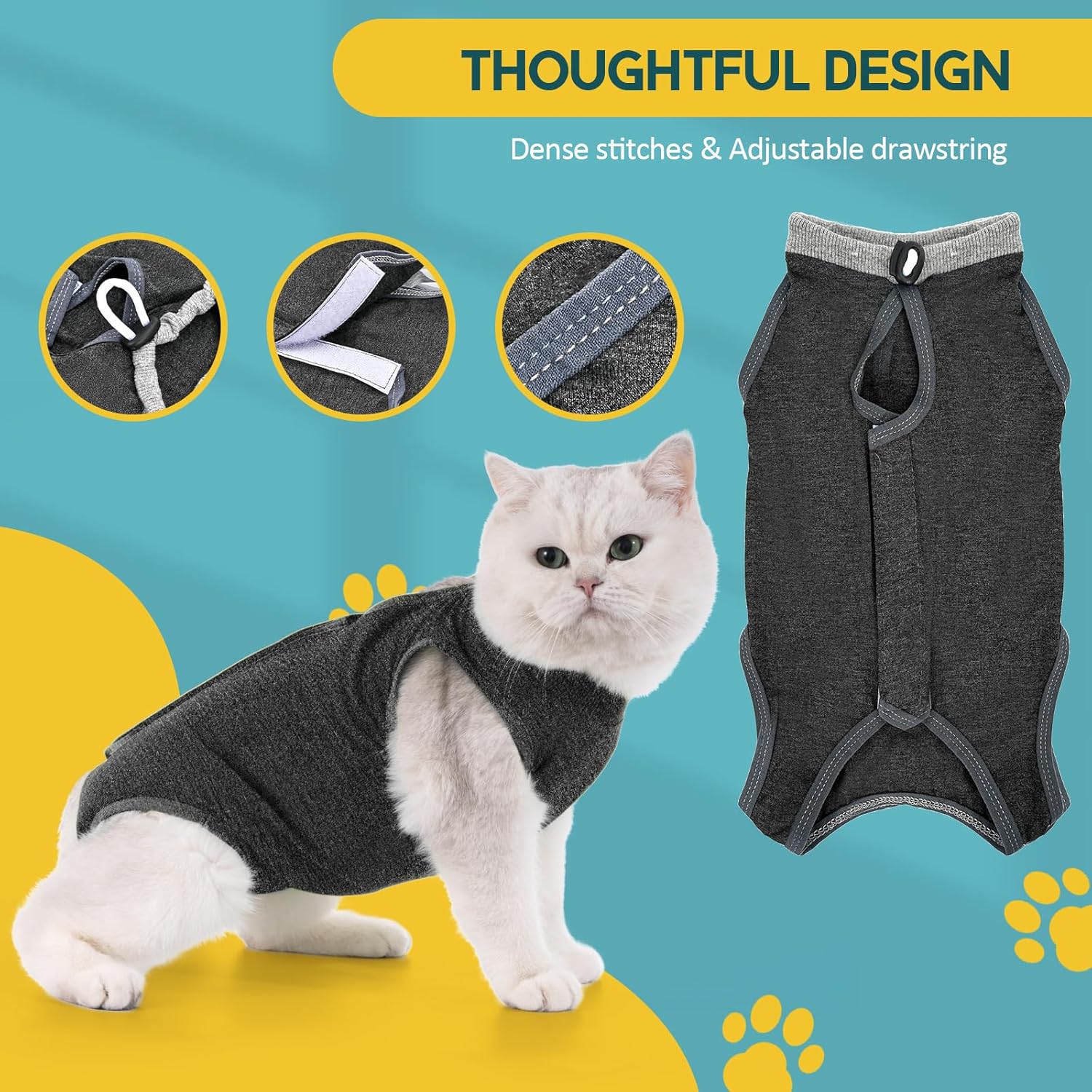 • Дишащ, тънък и мек модален материал. Тънък, мек, еластичен и не пречи на ежедневните дейности на котката. Удобен за носене и насърчава заздравяването и възстановяването. Моля, дайте на котката известно време да се адаптира към носенето му.