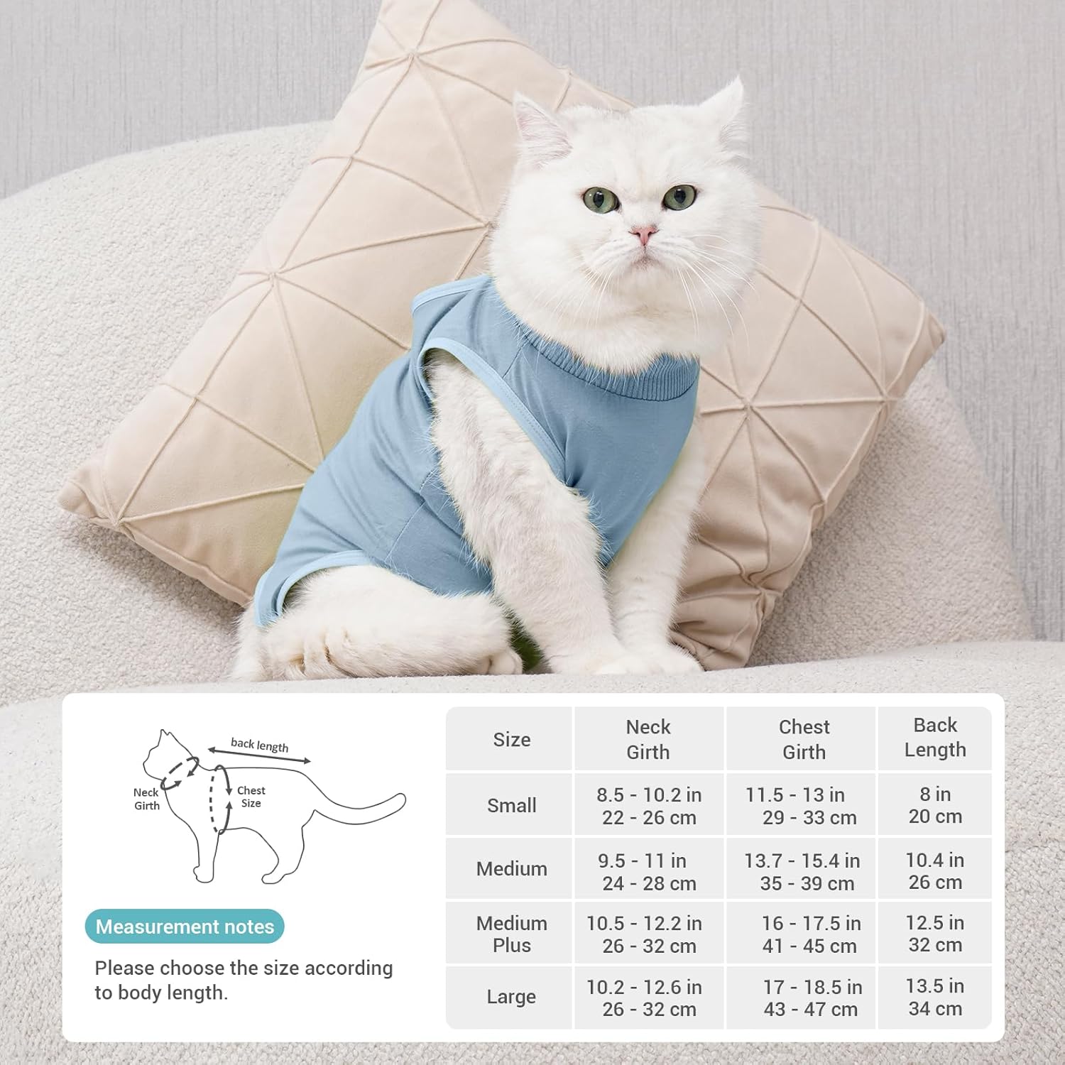• Дишащ, тънък и мек модален материал. Тънък, мек, еластичен и не пречи на ежедневните дейности на котката. Удобен за носене и насърчава заздравяването и възстановяването. Моля, дайте на котката известно време да се адаптира към носенето му.