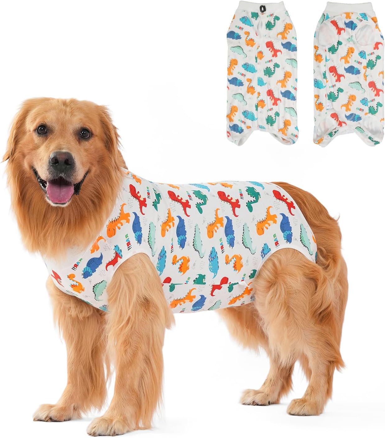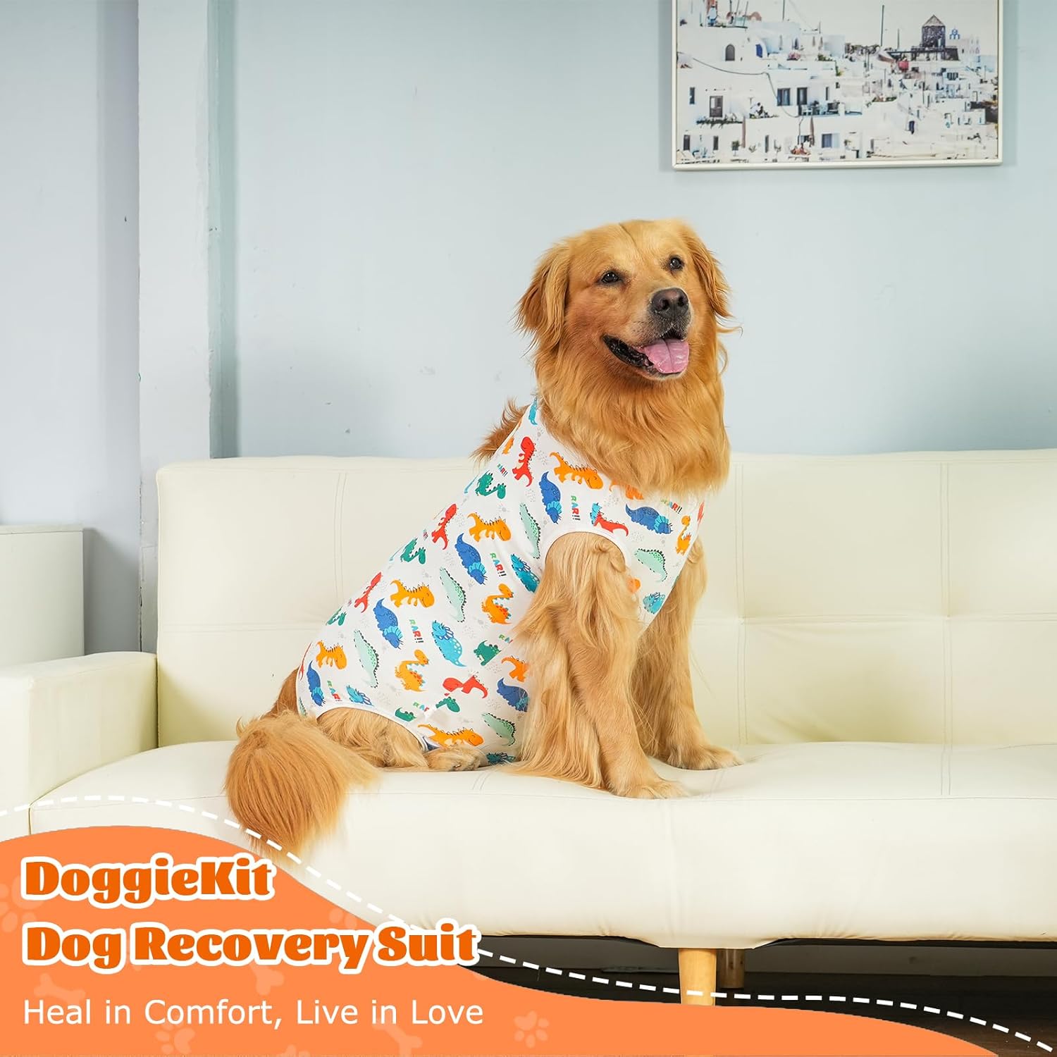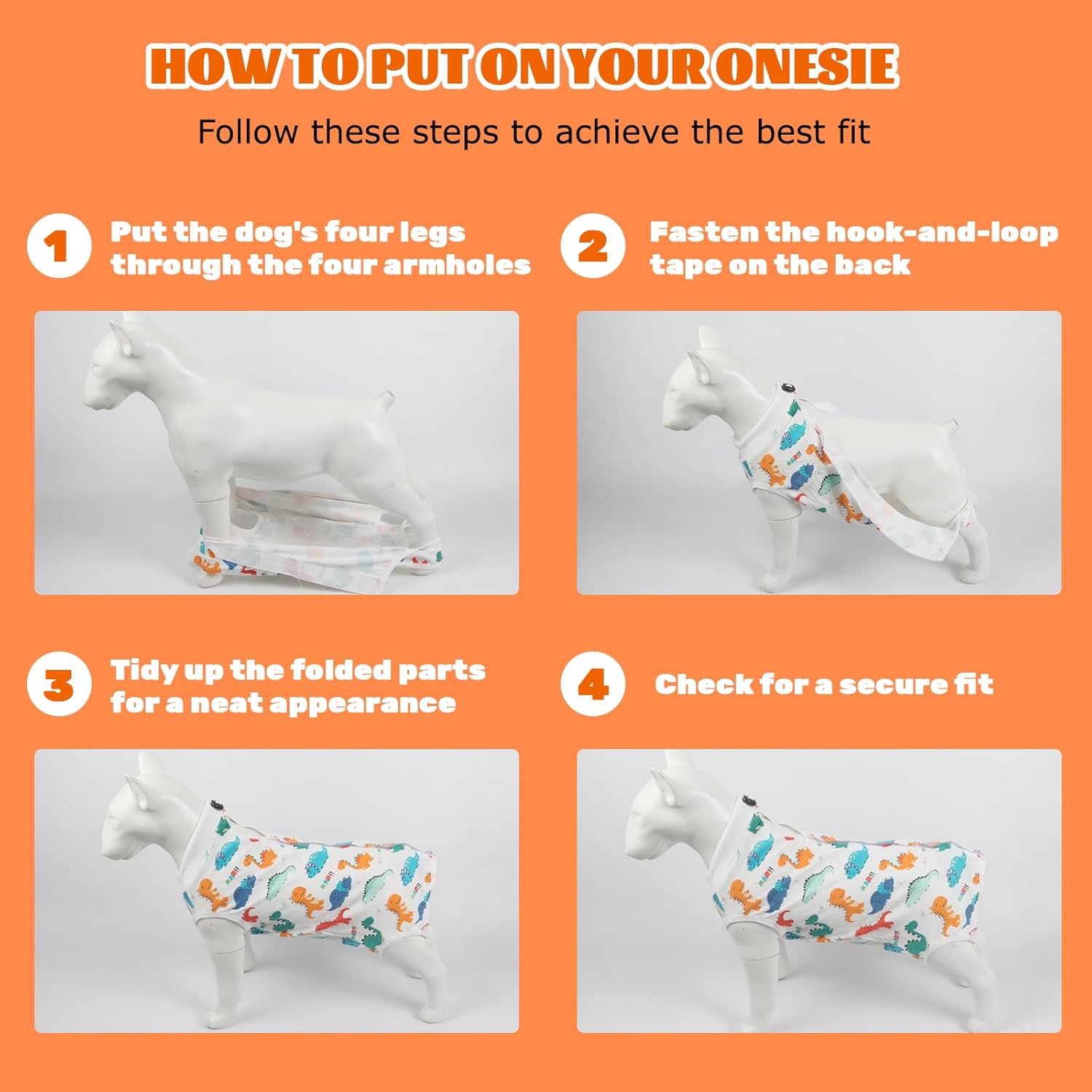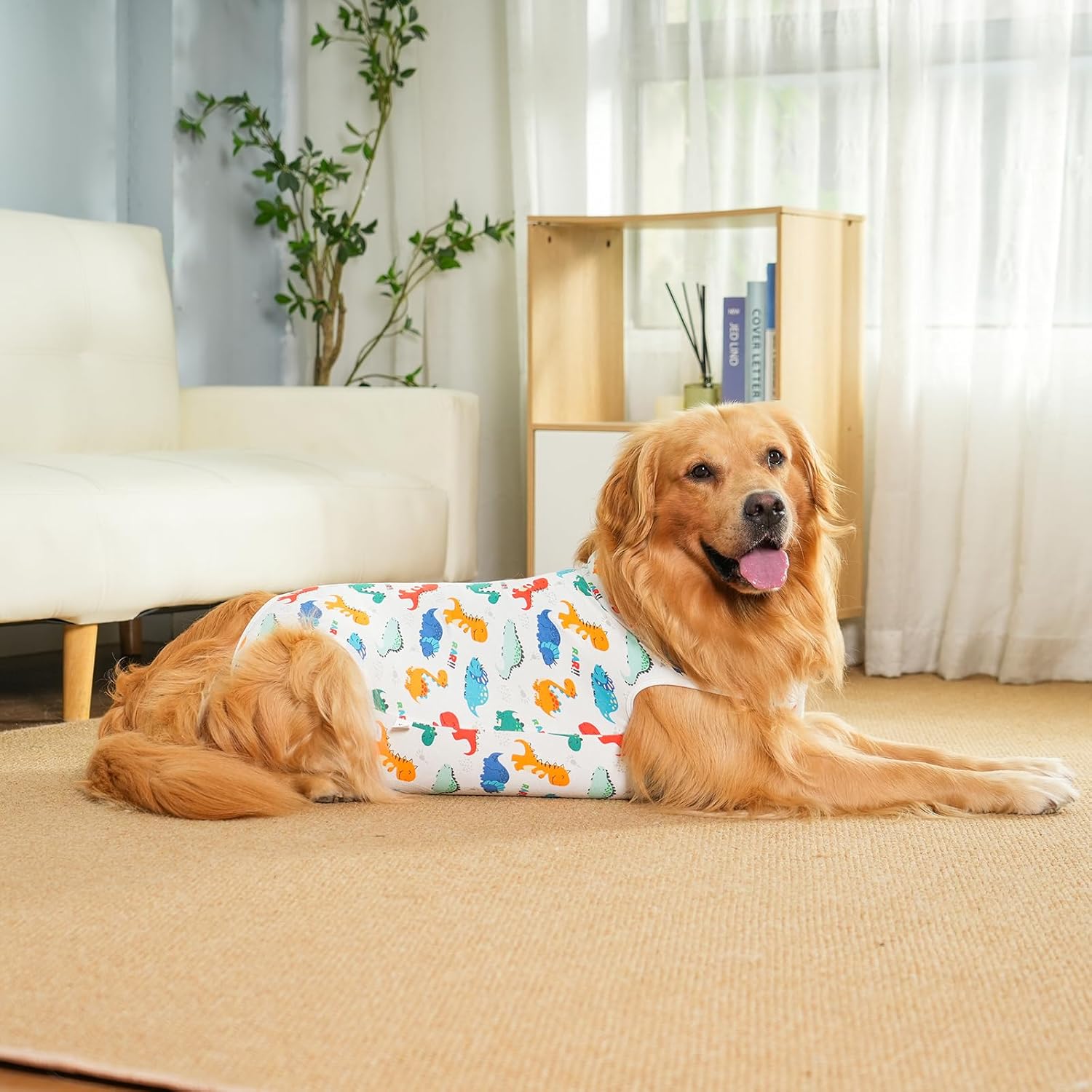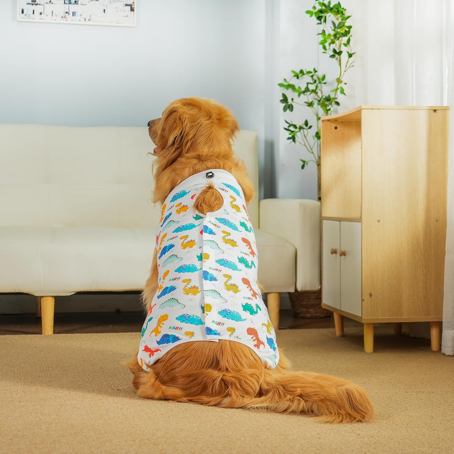 Боди за кучета след операция, боди за кучета след кастрация, мъжко куче, женско куче, дишащ еднокомпонентен костюм за защита от рани за кучета след операция, боди за кучета за женски кучета, защита от облизване за кучета (Бял динозавър, 3XL)