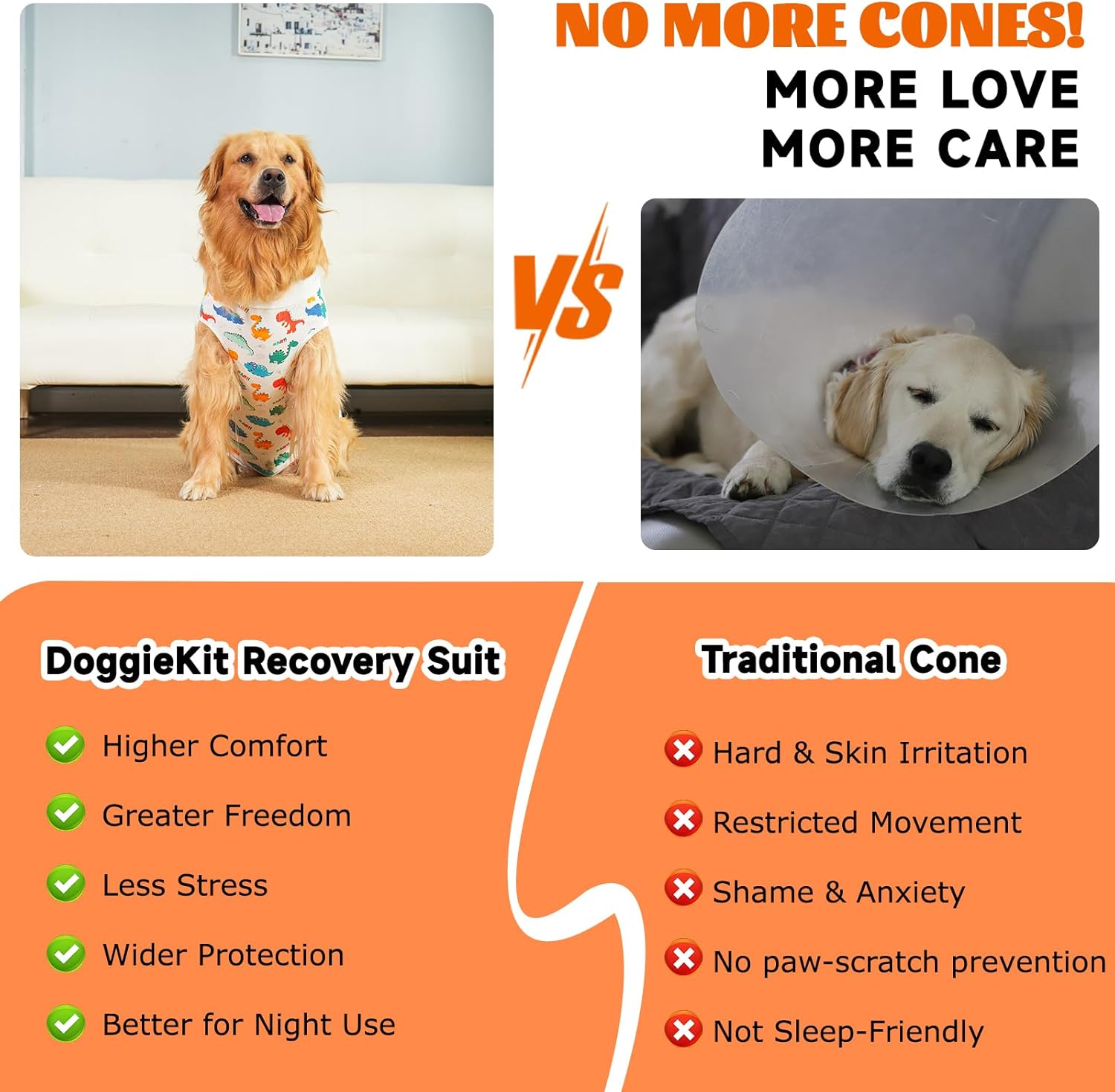 • Алтернатива на електронните нашийници и конусите – този възстановителен костюм за кучета е мек, дишащ и намалява раздразненията. Той позволява естествено движение и хранене, без да ограничава главата. Този костюм след кастрация причинява по-малко стрес и изглежда естествено, за разлика от неудобните нашийници. Той покрива оперираната зона, за да предотврати облизване и драскане, докато нашийниците само предотвратяват облизването. Освен това нарушава по-малко съня на кучето.