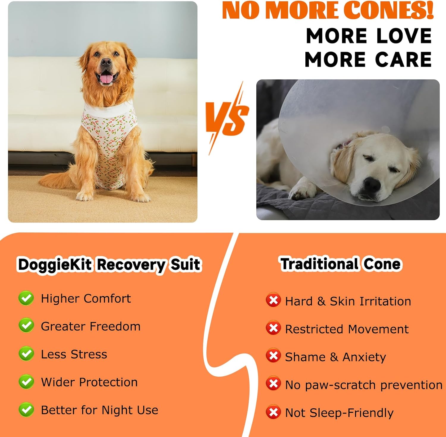 • Алтернатива на електронните нашийници и конусите – този възстановителен костюм за кучета е мек, дишащ и намалява раздразненията. Той позволява естествено движение и хранене, без да ограничава главата. Този костюм след кастрация причинява по-малко стрес и изглежда естествено, за разлика от неудобните нашийници. Той покрива оперираната зона, за да предотврати облизване и драскане, докато нашийниците само предотвратяват облизването. Освен това нарушава по-малко съня на кучето.