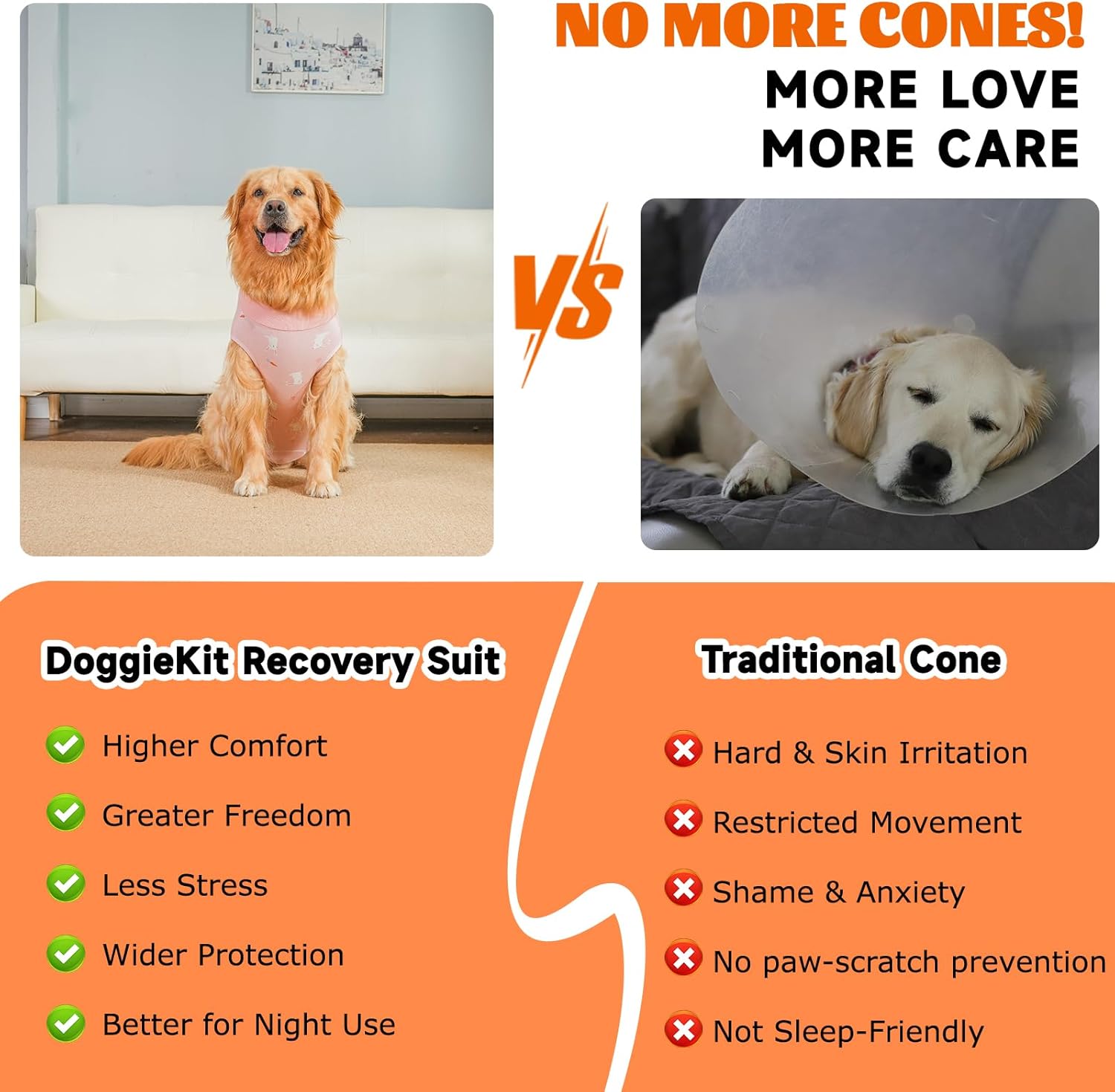 • Алтернатива на електронните нашийници и конусите – този възстановителен костюм за кучета е мек, дишащ и намалява раздразненията. Той позволява естествено движение и хранене, без да ограничава главата. Този костюм след кастрация причинява по-малко стрес и изглежда естествено, за разлика от неудобните нашийници. Той покрива оперираната зона, за да предотврати облизване и драскане, докато нашийниците само предотвратяват облизването. Освен това нарушава по-малко съня на кучето.