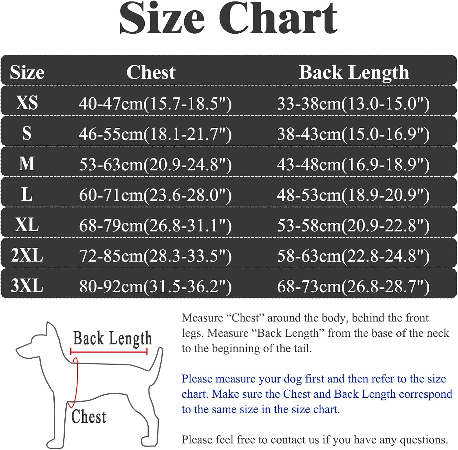 • Относно размерите: Предлага се в 7 размера от XS до 3XL, този боди за кучета е подходящ за малки, средни и големи кучета. Моля, измерете дължината на гърдите и гърба на вашето куче и след това вижте нашата таблица с размери, за да се уверите в перфектното прилягане. Ако имате нужда от помощ, не се колебайте да се свържете с нас.
