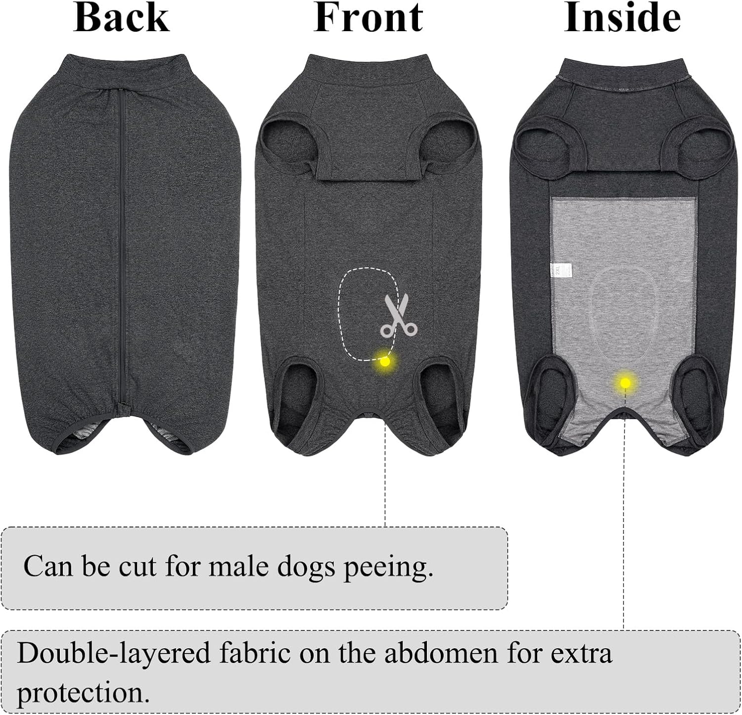 • Двуслоен корем: С двуслойния си памучен коремен панел, този хирургически възстановителен костюм за кучета предлага комфорт и защита след кастрация или коремни рани. Меката, дишаща и еластична материя осигурява сигурно прилягане, без да ограничава свободата на движение.