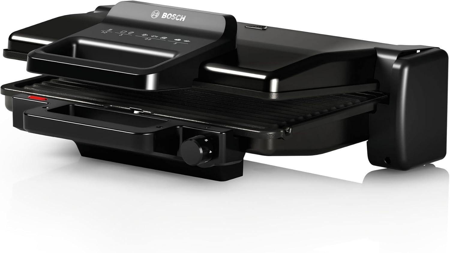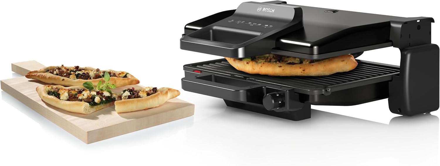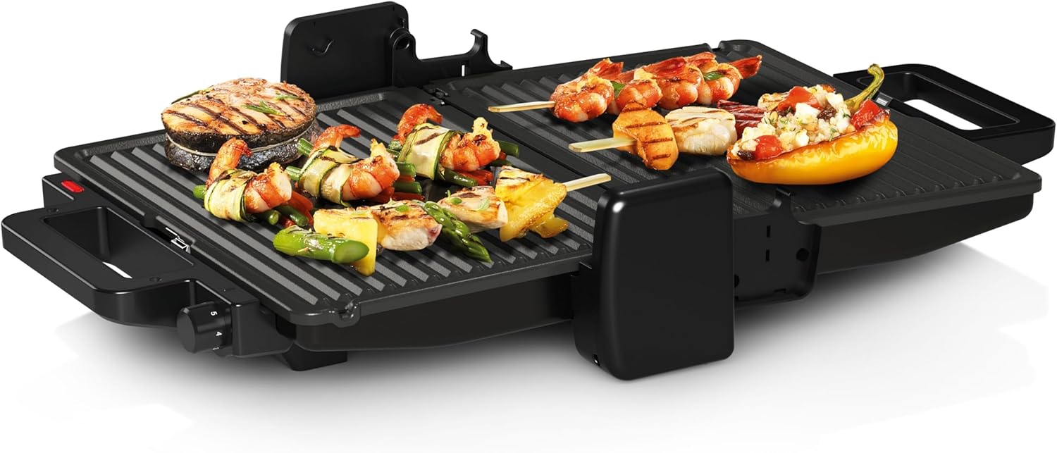 • Много опции за готвене благодарение на 3-те позиции за готвене: затворена като обикновен контактен грил, отворена като настолен грил или затворена с горно и долно нагряване за печене или претопляне.