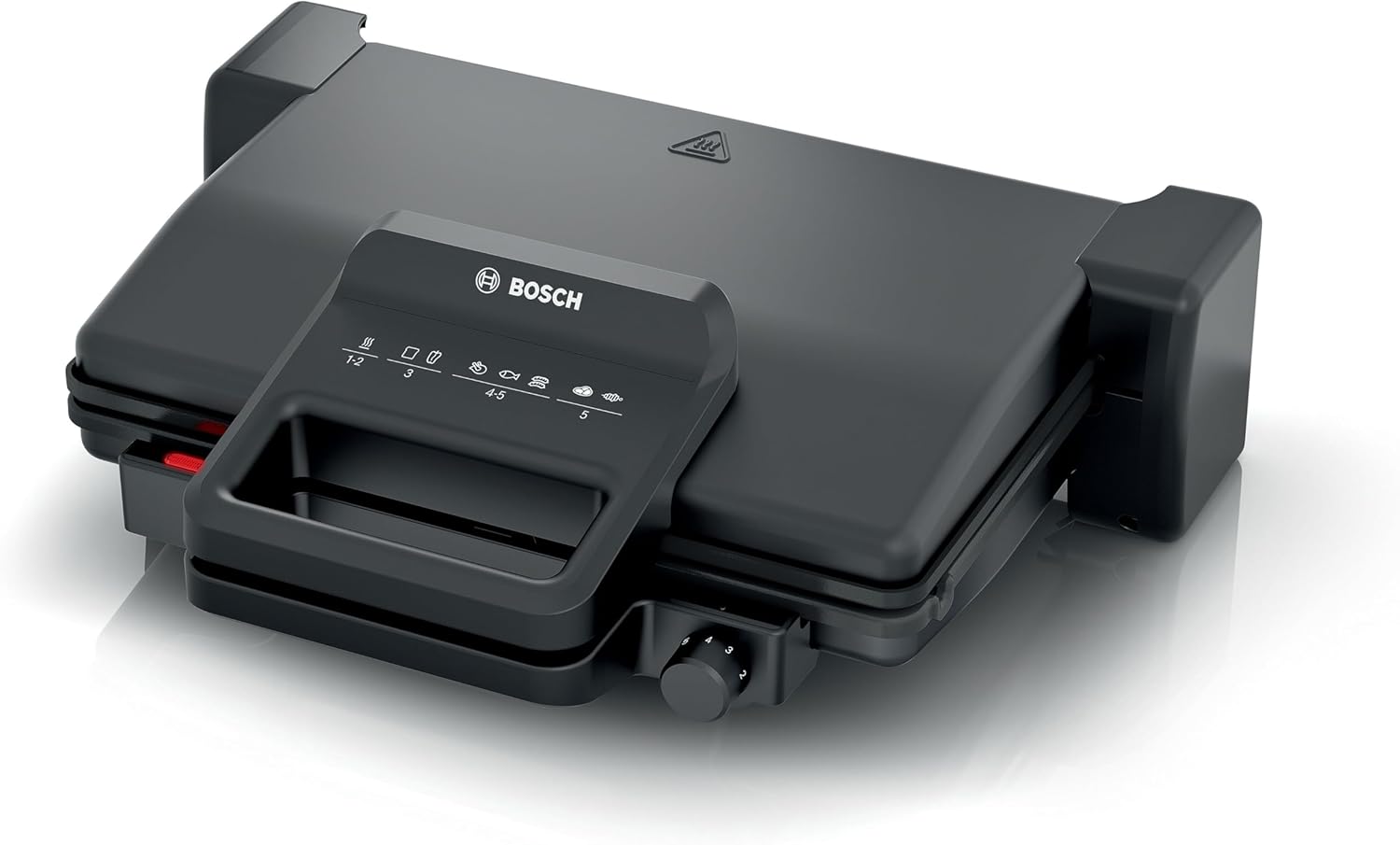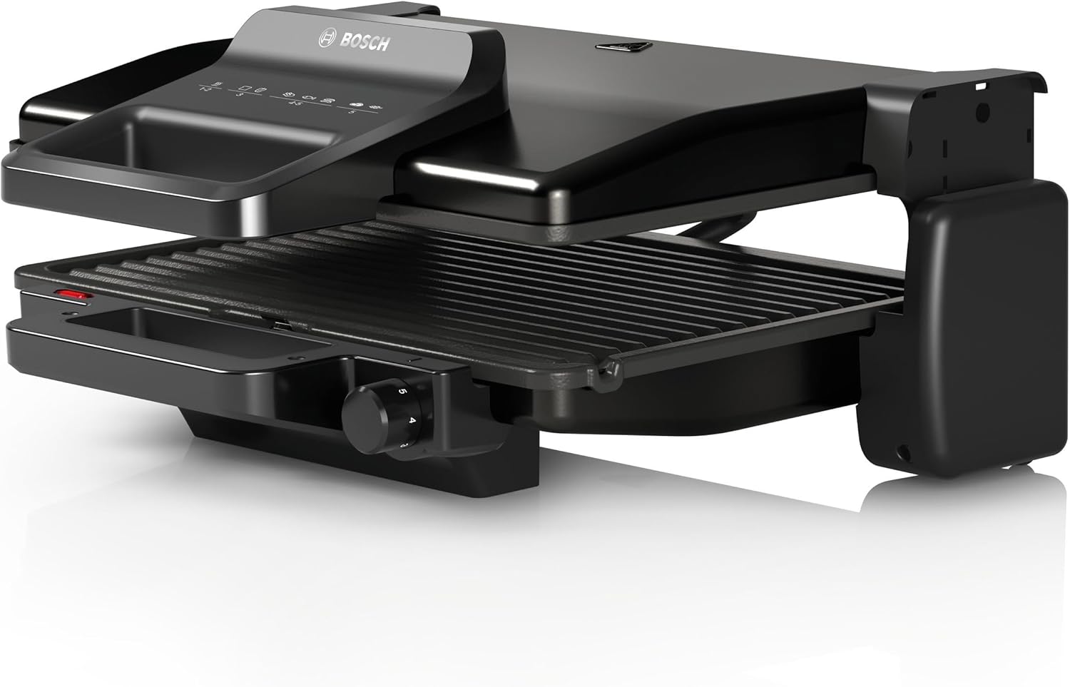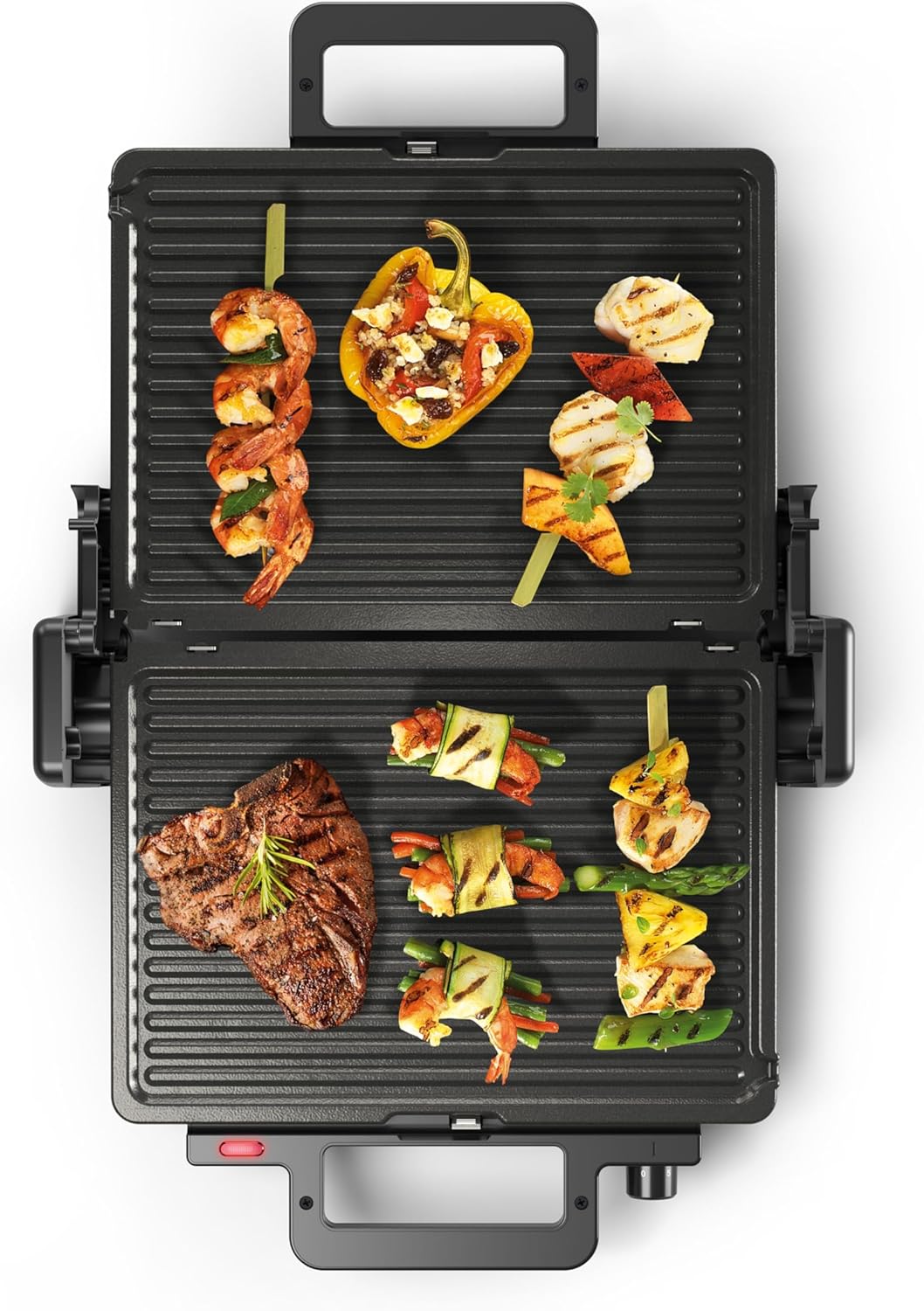 • Много опции за готвене благодарение на 3-те позиции за готвене: затворена като обикновен контактен грил, отворена като настолен грил или затворена с горно и долно нагряване за печене или претопляне.