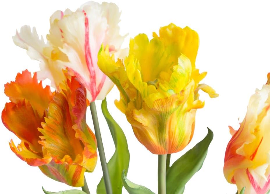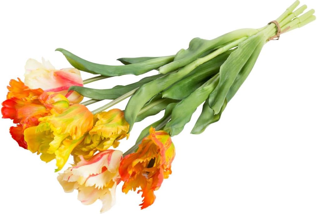 Красив букет от изкуствени лалета, състоящ се от 7 отделни лалета/пъпки, свързани помежду си с рафиева панделка. Тези изкуствени цветя са изработени от висококачествена пластмаса и затова не само имат висококачествен външен вид, но и истински ефект на допир при допир. Лентата на лалетата е с правилния размер, за да бъде декорирана в малка ваза директно на масата.