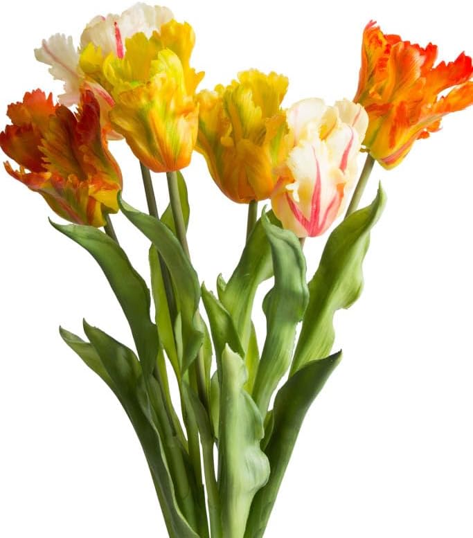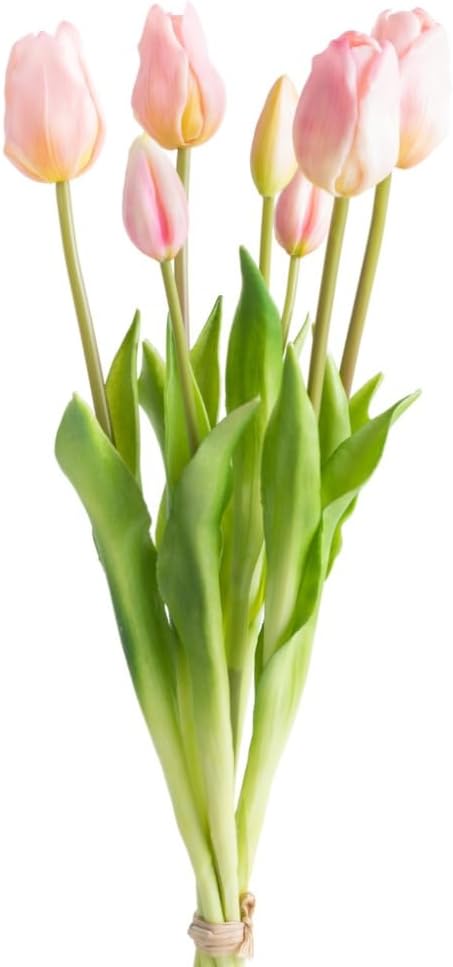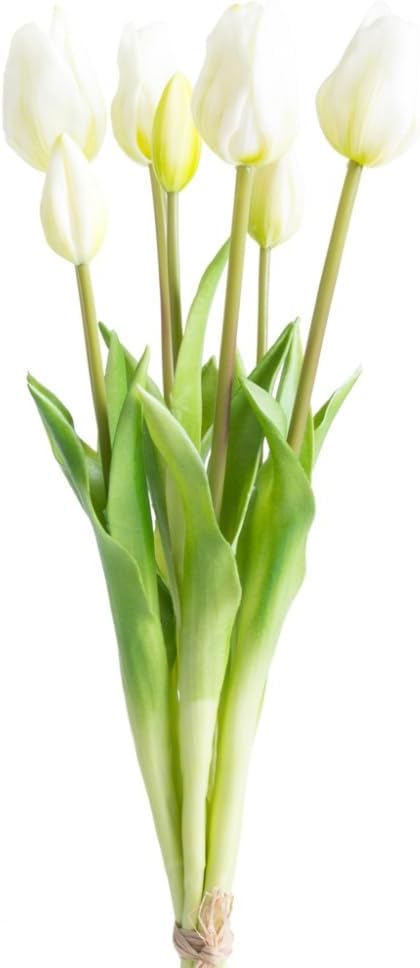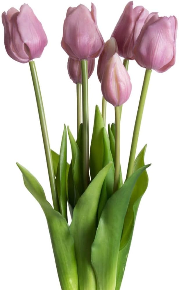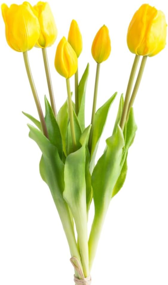 Красив букет от изкуствени лалета, състоящ се от 7 отделни лалета/пъпки, свързани помежду си с рафиева панделка. Тези изкуствени цветя са изработени от висококачествена пластмаса и затова не само имат висококачествен външен вид, но и истински ефект на допир при допир. Лентата на лалетата е с правилния размер, за да бъде декорирана в малка ваза директно на масата.