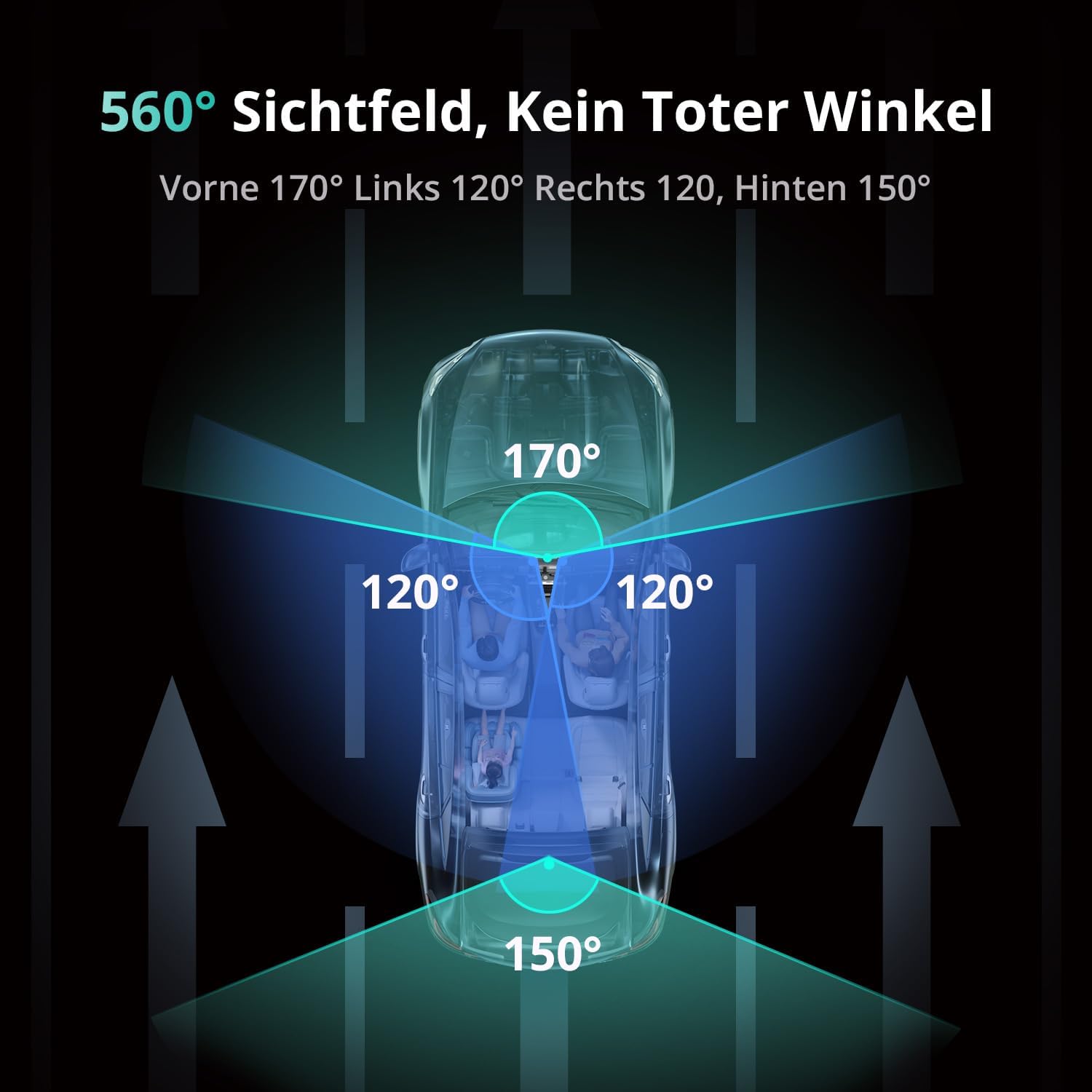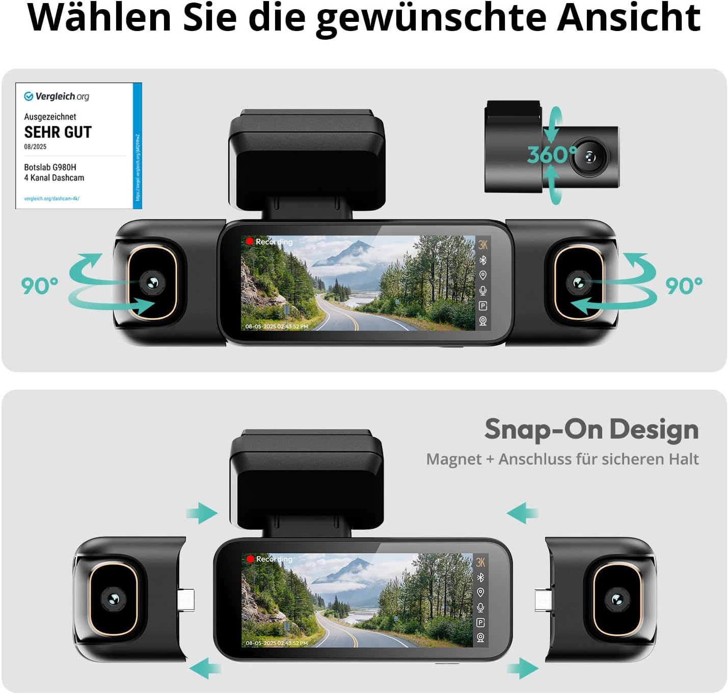 • 【3K 4-канална 560° видеорегистратор】: Благодарение на 4-каналния си 3K запис, 4-каналният видеорегистратор BOTSLAB наблюдава вашия автомобил отпред, отзад и дори отстрани. Предната камера предлага по-рязко качество на изображението от 2.7K. Широкият ъгъл на видимост от 560° (170° отпред, 120° наляво и надясно, 150° отзад) осигурява пълна безопасност и е идеален за градски трафик или тесни места за паркиране. И четирите камери (3K + 1080P*3) записват едновременно, за да ви предоставят надеждни доказателства за всякакви произшествия. Страничните камери разполагат с подвижни магнитни стойки, което ви позволява лесно да превключвате между 3-канален 4K режим на видеорегистратор (4K + 1080P*2) ​​и 2-канален 4K режим на видеорегистратор (4K + 1080P).