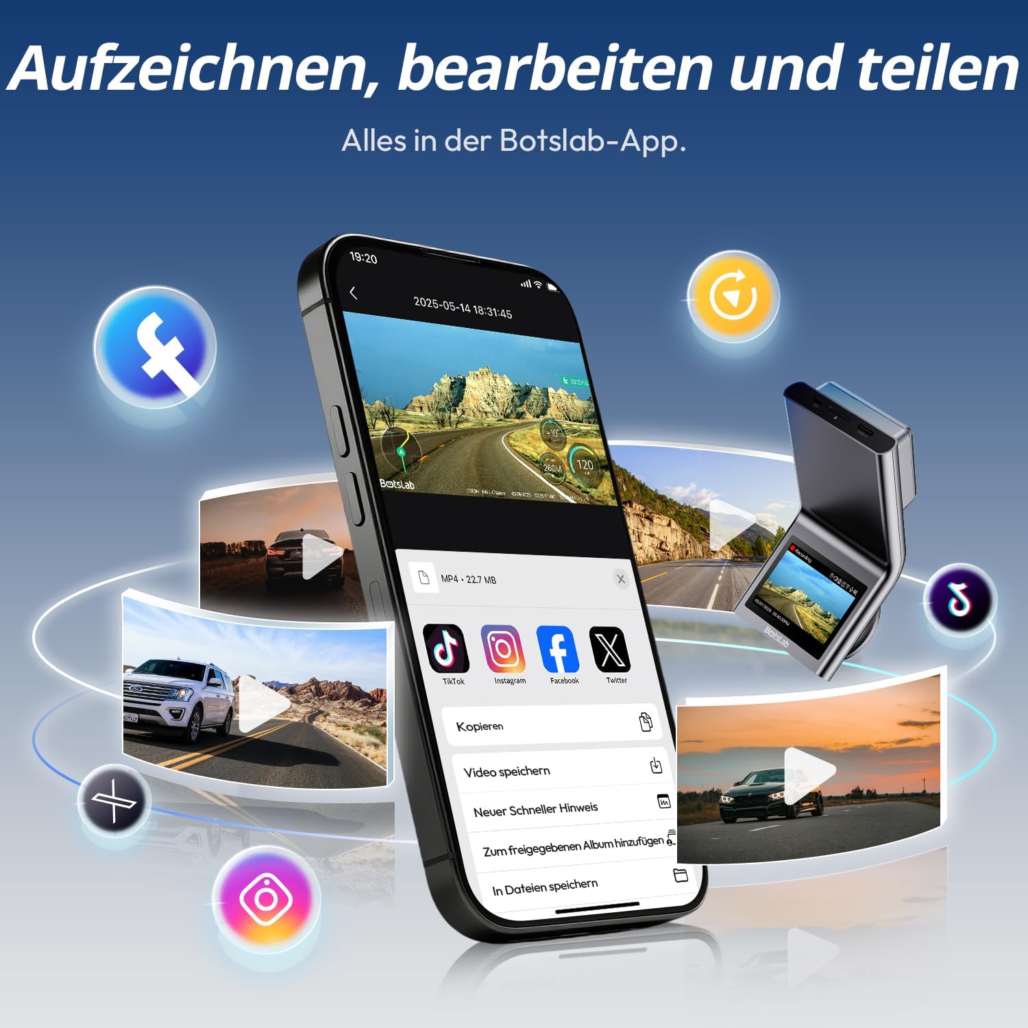 BOTSLAB 4K Автомобилна видеорегистраторна камера за предно-задно видео със STARVIS 2 сензор, WDR двуканална видеорегистраторна камера с 64GB SD карта, гласово управление и 5GHz Wi-Fi, WiFi автомобилна камера, GPS, супер нощно виждане, до 256GB