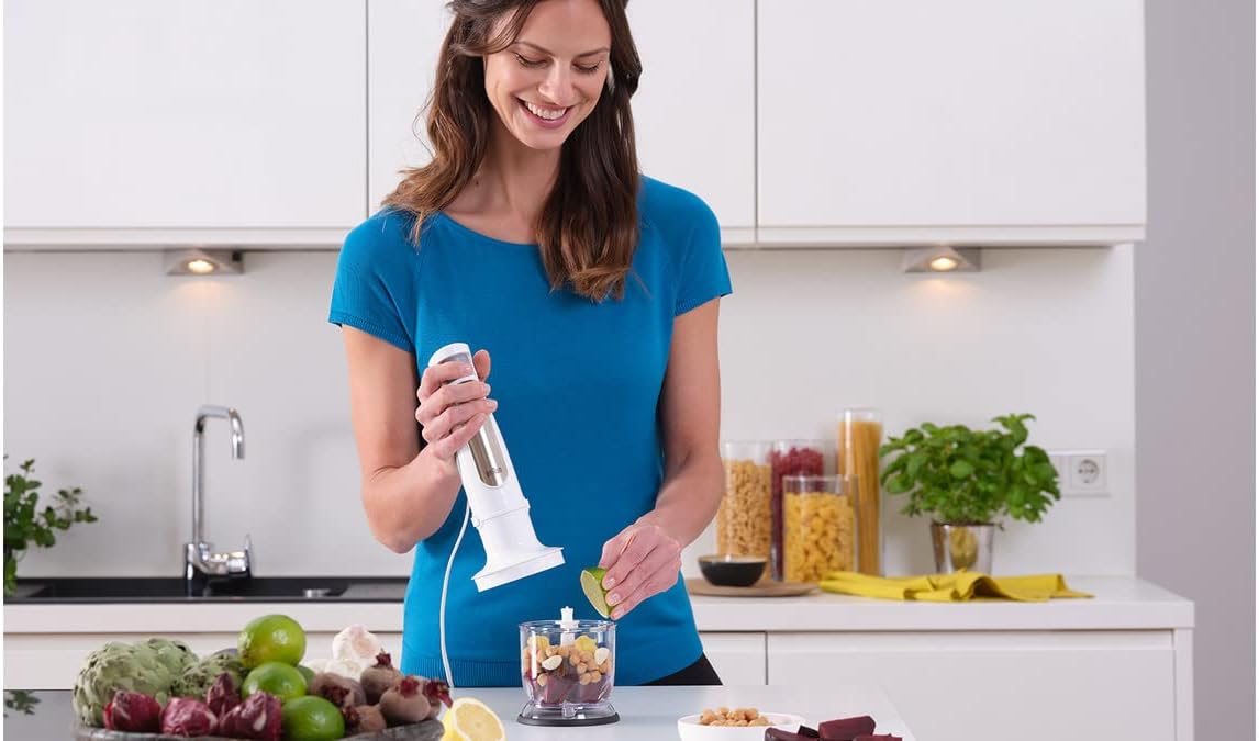 • Всичко в едно: Мощният ръчен блендер се предлага с много аксесоари, които могат да се сменят с едно щракване на бутон - бъркалка, чопър, стационарен миксер, включително нож за трошене на лед, както и чаша за смесване и измерване.