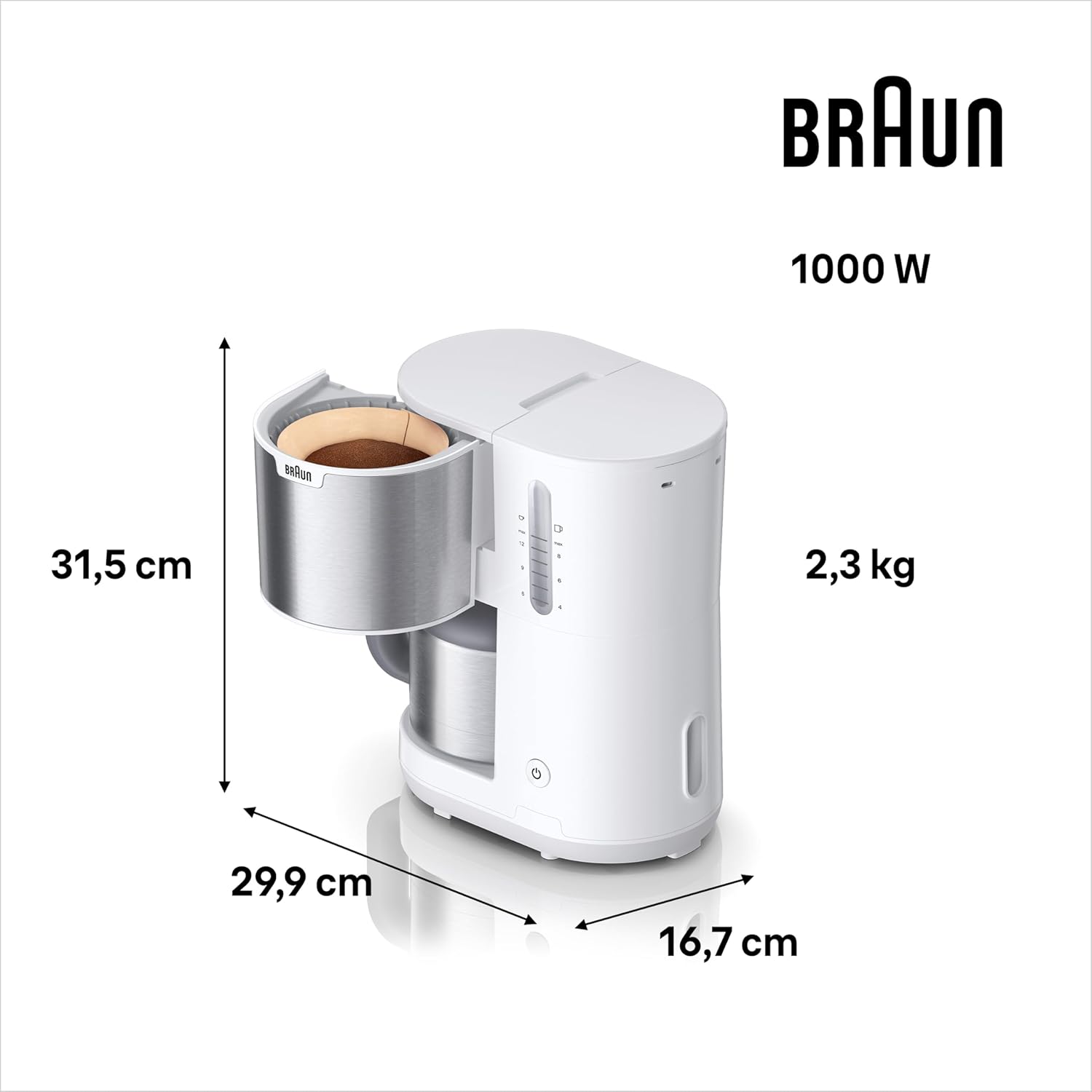 Braun PurShine KF1505 WH филтърна кафемашина, термокана от неръждаема стомана 1.2 л за до 9 чаши, система OptiBrew, функция Drip Stop, въртяща се филтърна кошница, автоматично изключване, 1000 W, бяла