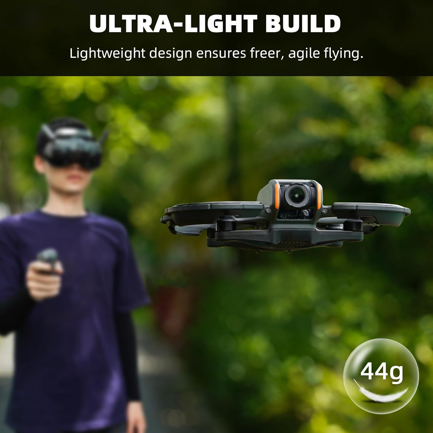 • Ултралек дизайн, без влияние върху полета - Лекият дизайн осигурява по-свободно и пъргаво летене, без да добавя допълнително напрежение към дрона Avata 2. Той не влияе на времето за полет и осигурява стабилност и висока устойчивост на удар, което прави летенето по-комфортно и безгрижно.