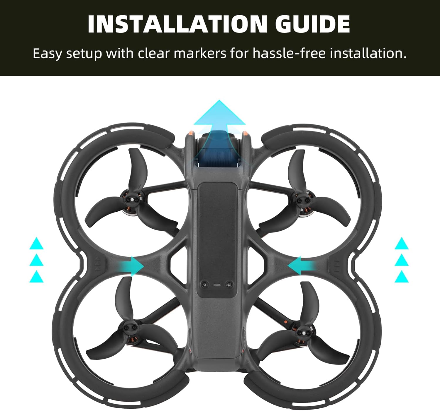 • МОНТАЖ БЕЗ ИНСТРУМЕНТИ В ЕДНА СТЪПКА - Инсталирайте нашите предпазители за перки на вашия Avata 2" за секунди. Тези предпазители се доставят с ясни инструкции за монтаж и се закрепват безпроблемно, без да надраскат корпуса на дрона или да повлияят на капачката на обектива и други компоненти.
