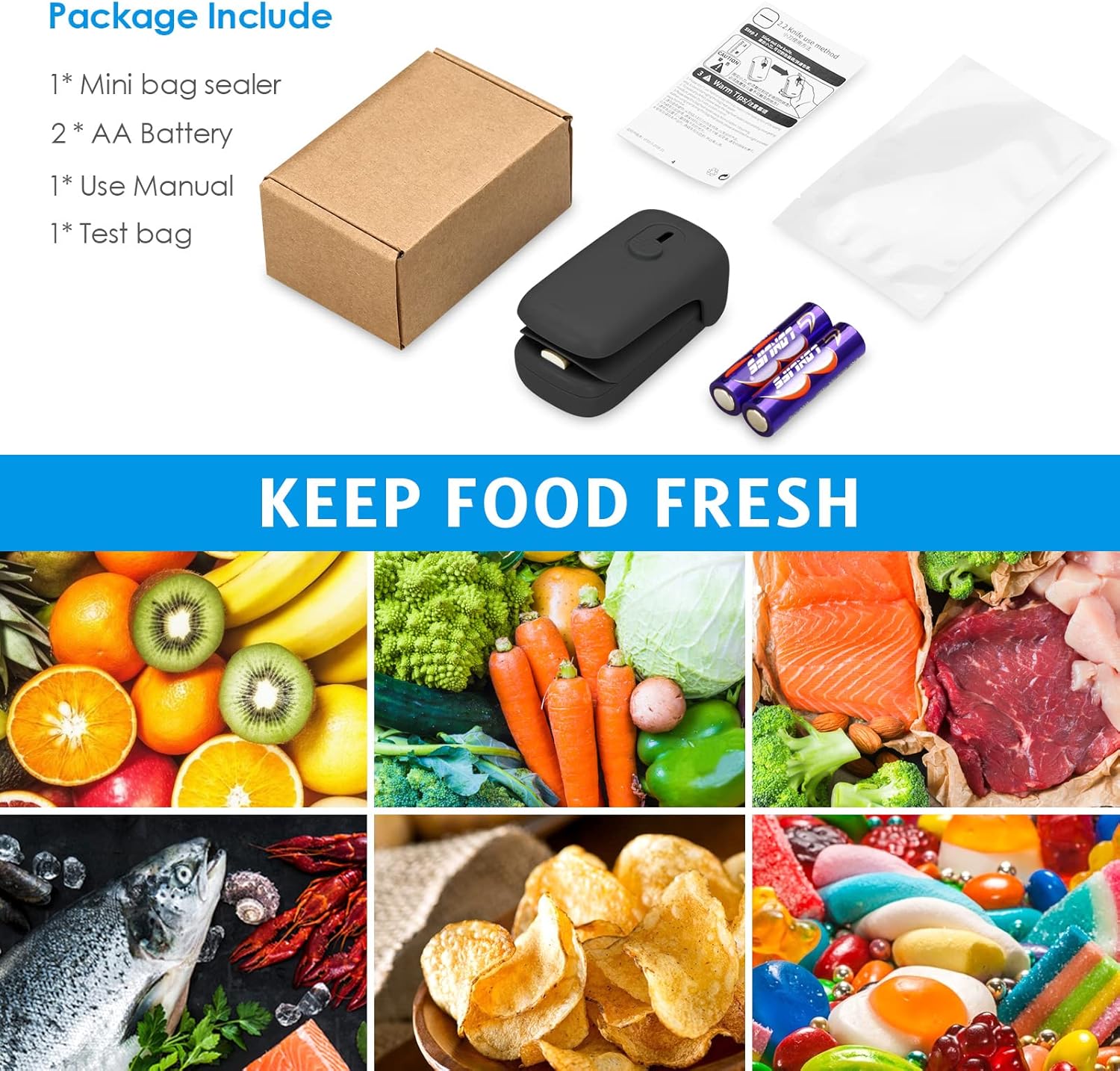 1 x Mini Bag Sealer2 x AA Batteries1 x User Manual1 x Test Bag