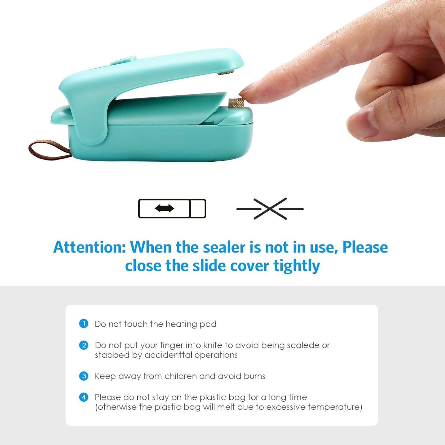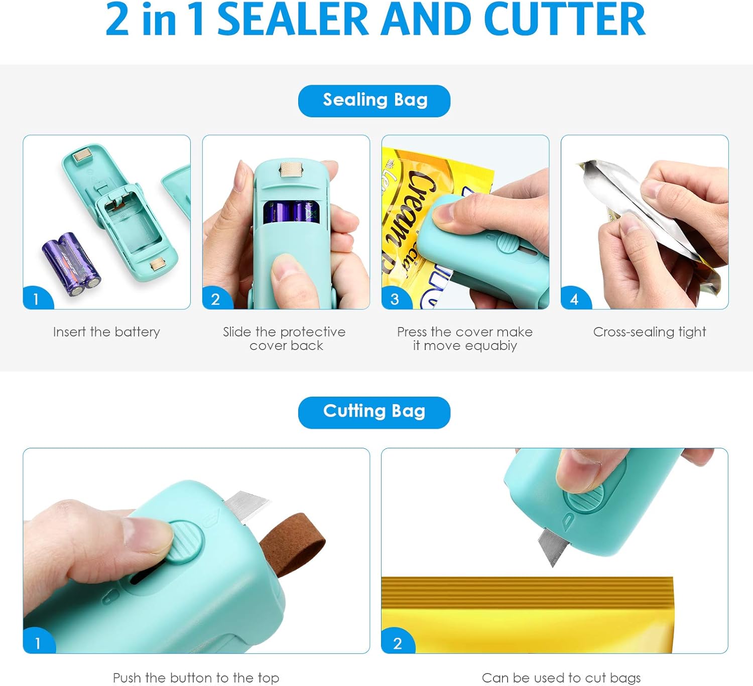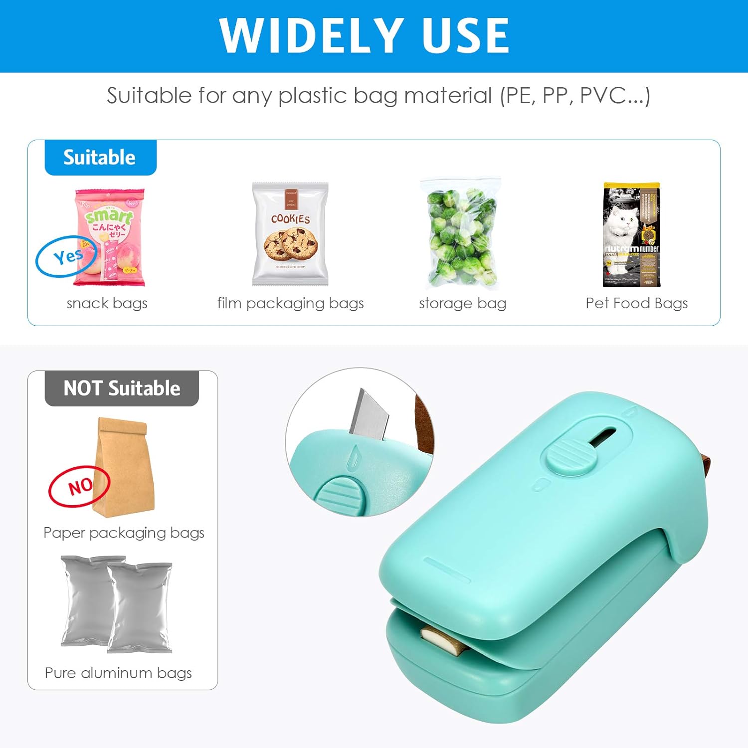 2 в 1 запечатващ и режещ уред: Той не е само запечатващ уред за торбички, но и режещ уред. Преносим и компактен: Малкият му размер го прави по-лесен за носене и съхранение. Лесен за употреба: Поставете торбата, която ще се запечатва, в средата и я издърпайте бавно и с постоянна скорост. Широко приложение: Подходящ за повечето пластмасови торбички с дебелина ≦0,3 мм, идеален за дома, кухнята, офиса, училището и пътуването и др.