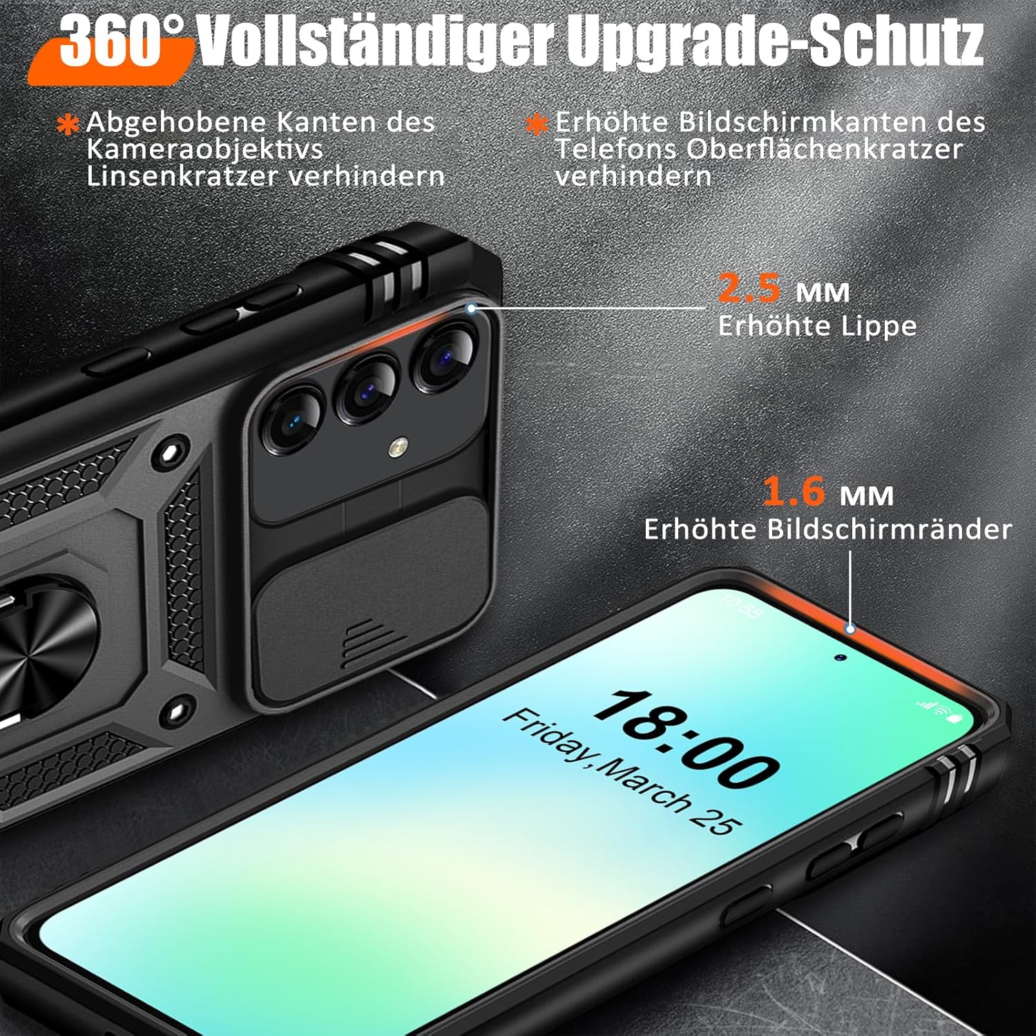 • Защита от военен клас: калъфът за Galaxy S25 използва уникален TPU с ръбове в комбинация с вградени PC 2-в-1 затваряния, за да предпази телефона ви от падания, драскотини и удари. Защитата от военен клас с технология с въздушна възглавница осигурява цялостна защита за вашето оборудване. Дизайн с плъзгач на обектива: Повдигната рамка за защита на камерата. Капачката покрива обектива и го предпазва от прах и драскотини.