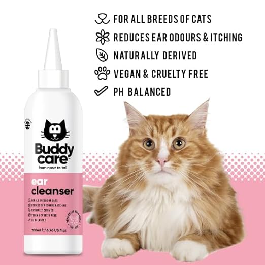 Поглезете ушите на вашия пухкав приятел с нежната грижа, която заслужава, използвайки почистващия препарат за уши за котки Buddycare!
