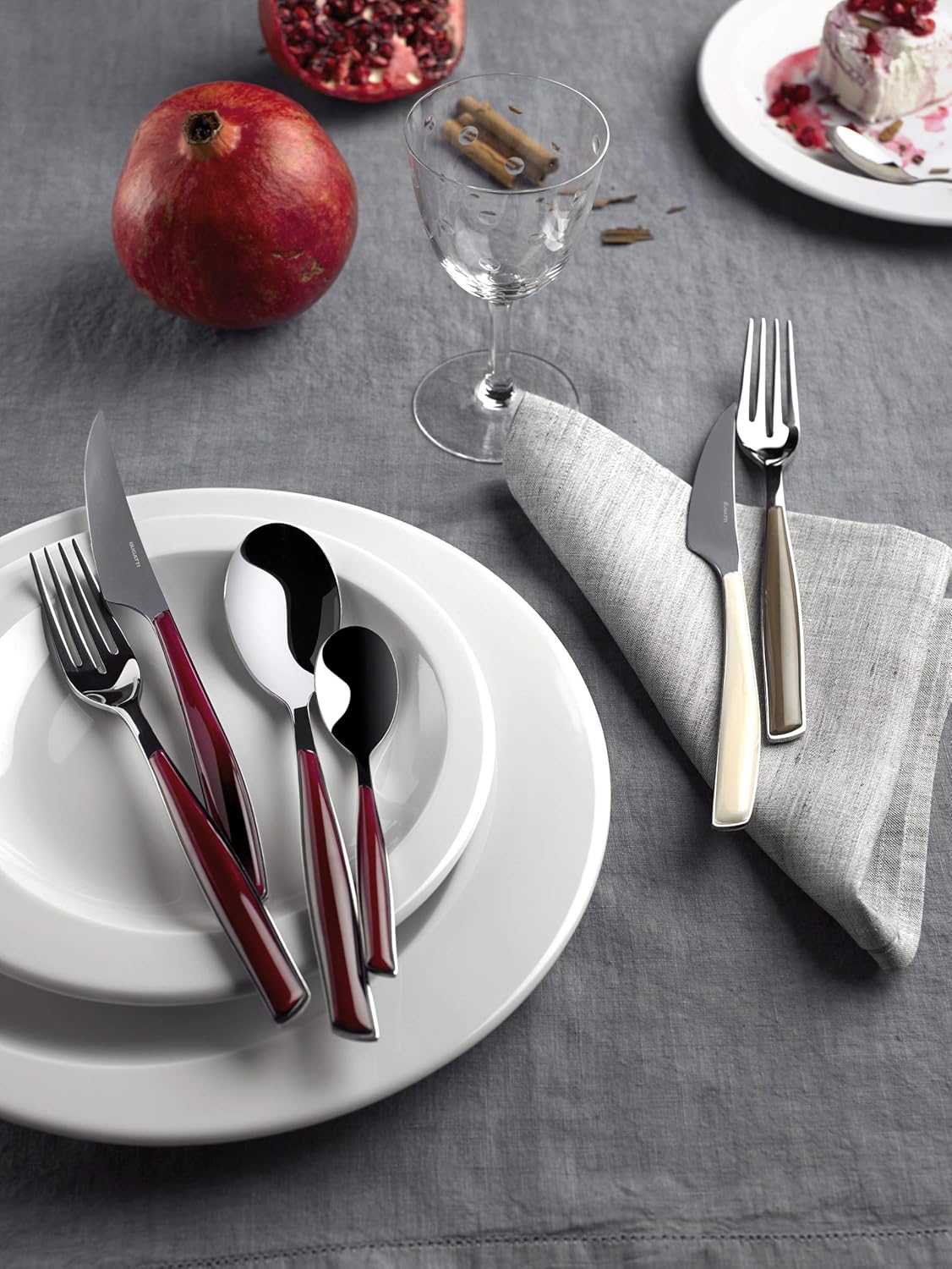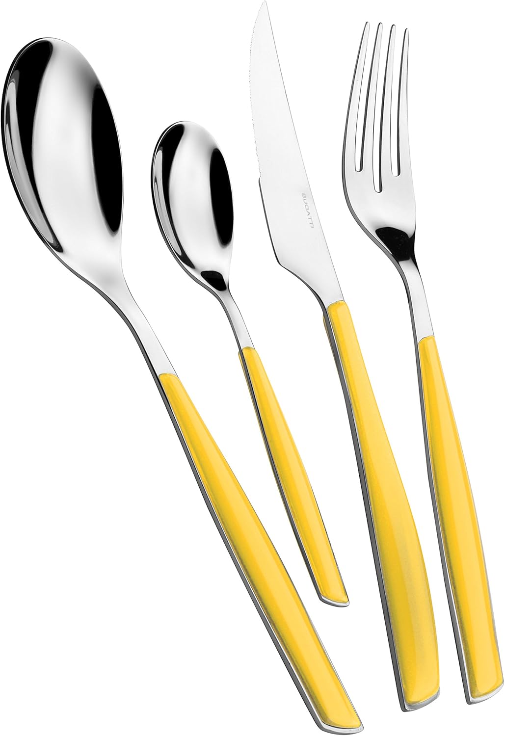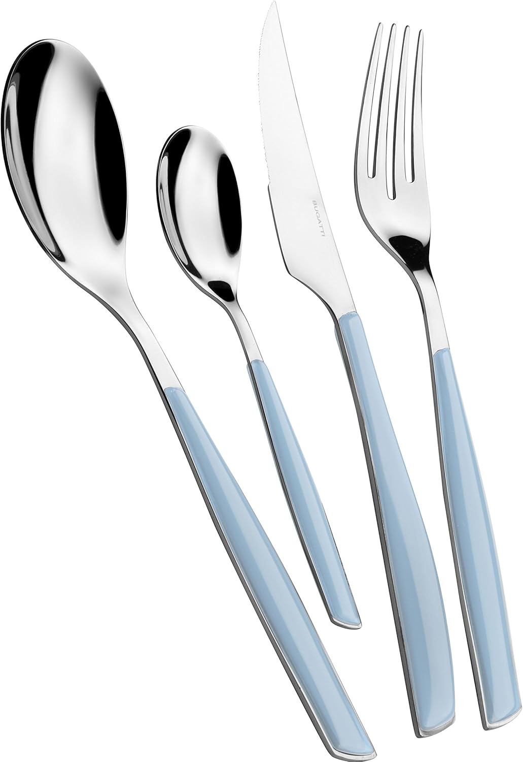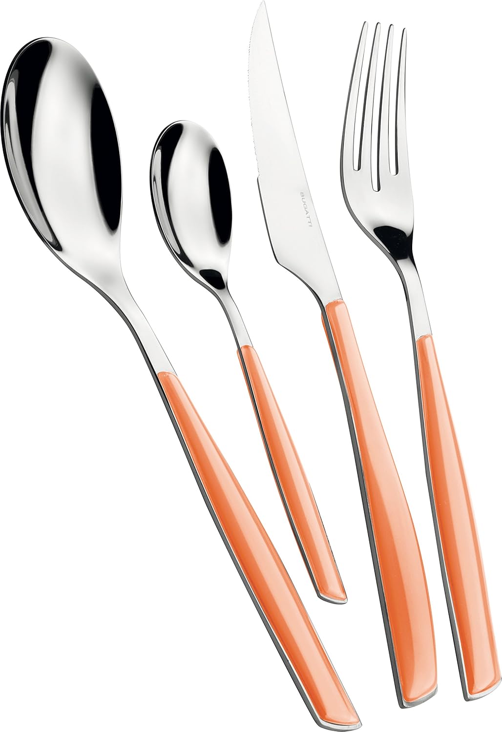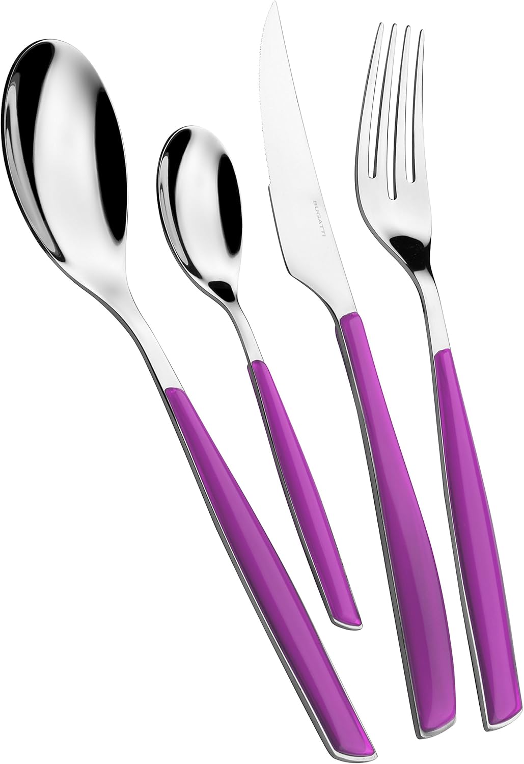 Прибори за хранене, изработени от неръждаема стомана 18/10, с прозрачна SAN дръжка, отличаваща се с фини цветови вариации. Произведени по технологията за двойно формоване Pro-Tech-System на Bugatti, тези прибори имат прозрачен ефект и ярки цветове, които остават непроменени с течение на времето. Приборите за хранене Glamour могат да се мият в съдомиялна машина при средни до ниски температури (50-55°C). За да запазите най-добрия си вид за години напред, моля, следвайте инструкциите за грижа на продукта.