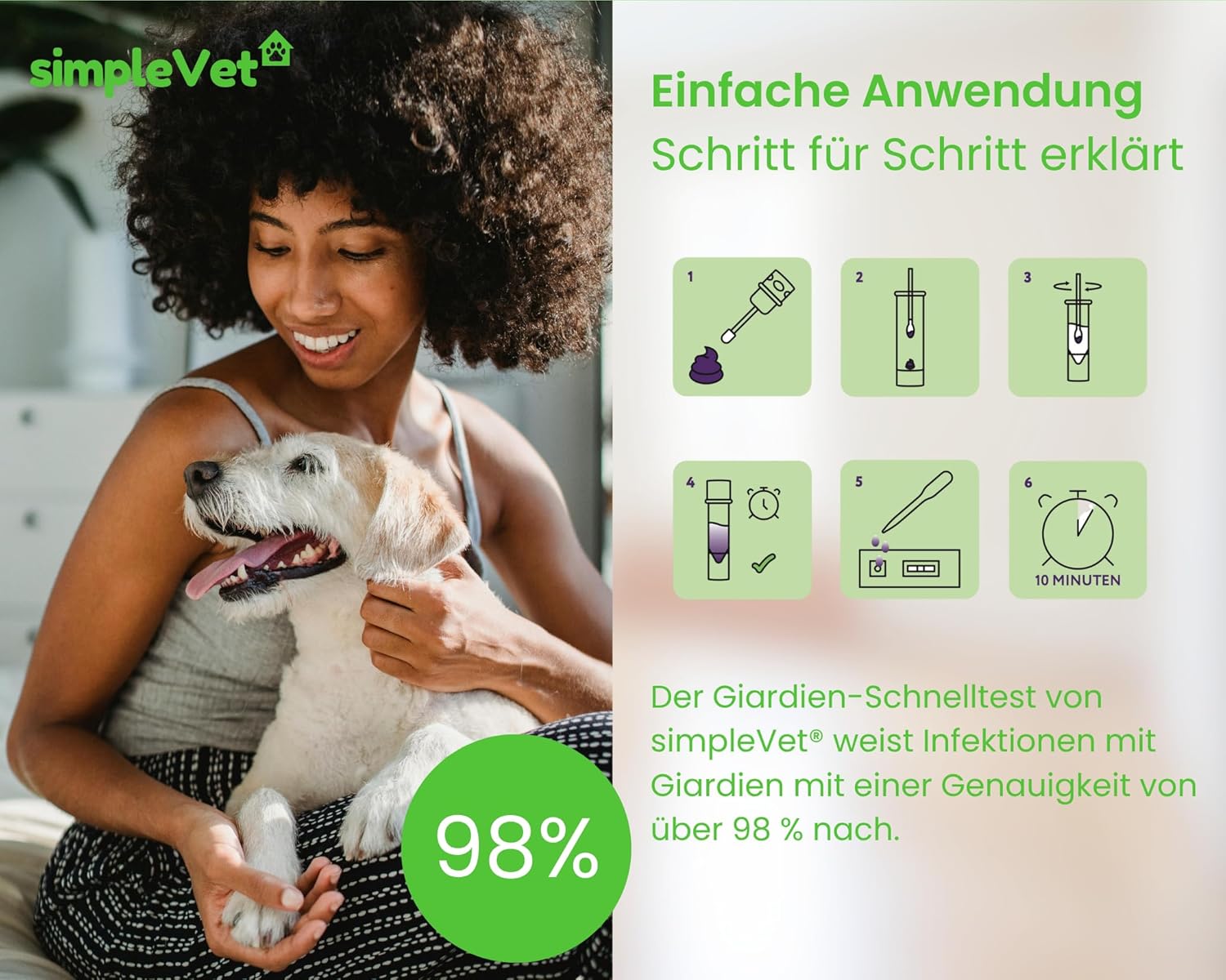• БЪРЗ ТЕСТ ЗА GIARDIA ЗА КУЧЕТА: Тестът simpleVet е надежден бърз тест за Giardia при кучета. Той открива антигени на Giardia в проби от изпражнения в рамките на 5-10 минути. Идеален за собственици на домашни любимци, които се нуждаят от бързи отговори.