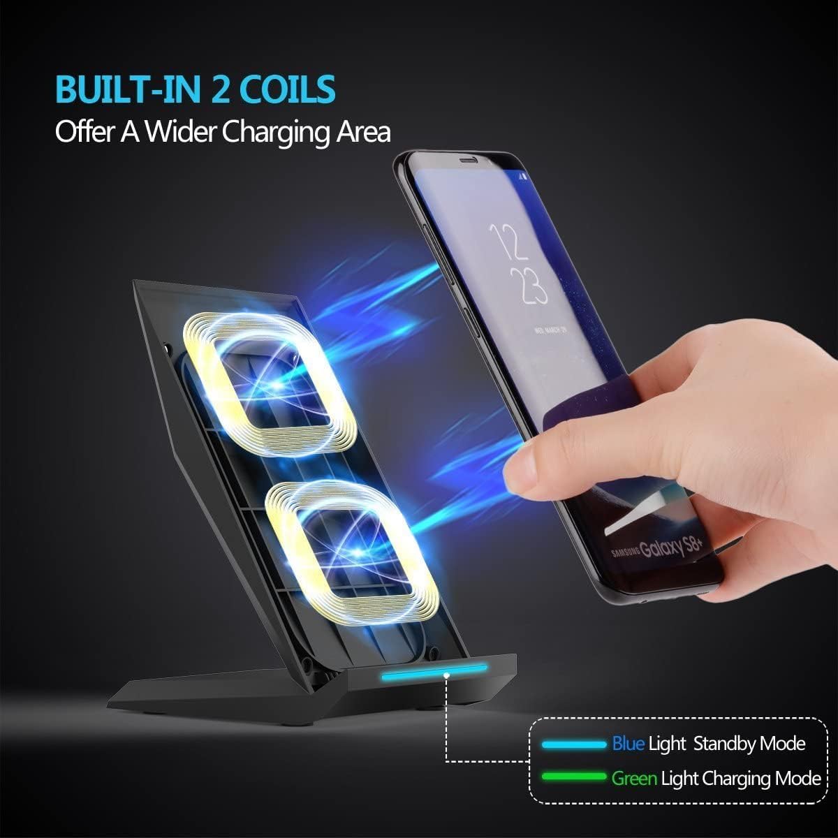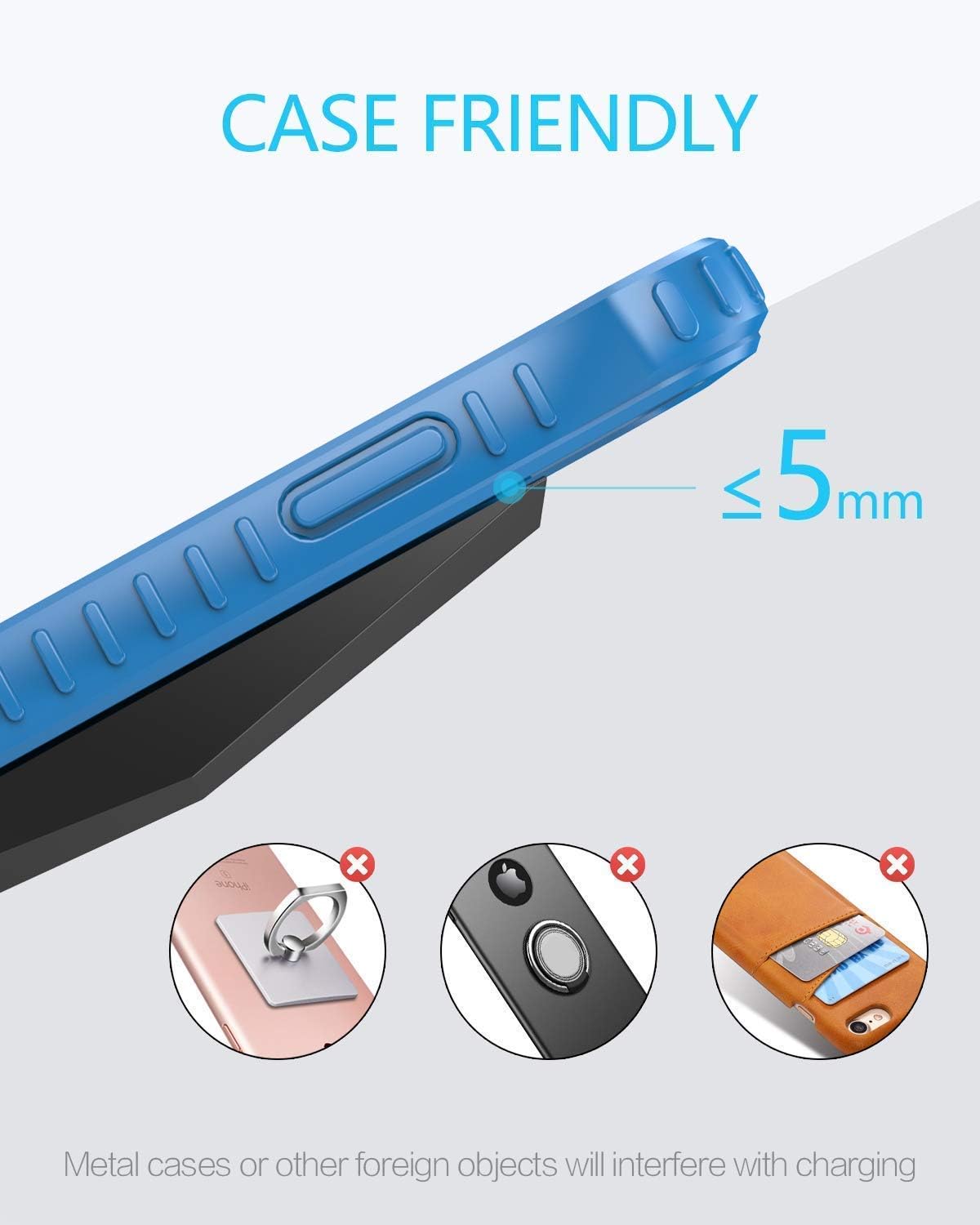 • Висока ефективност на безжичното зареждане: най-новият интелигентен контролен чип осигурява висок процент на конверсия от 80%. Станции за зареждане на мобилни телефони с вградена верига за защита от презареждане и преобръщане, никога не презареждат батерията ви и не изразходват енергия, напълно екологични. Работи с повечето видове калъфи, като гумени калъфи, ултрахибридни корпуси, пластмасови/TPU/PC калъфи; не трябва да са по-дебели от 5 мм.