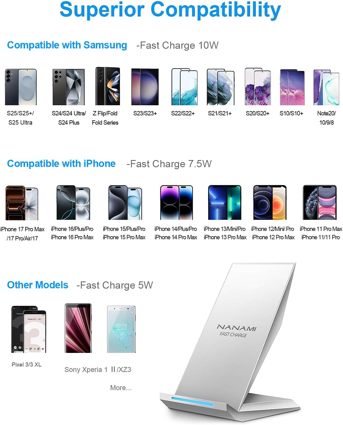 • Бързо зареждане и съвместими модели: Бързото безжично индукционно зарядно устройство NANAMI ви позволява да зареждате устройствата си с 40% по-бързо със стандарта за бързо безжично зареждане, съвместимо със Samsung Galaxy S25/S25 Ultra/S25 Plus/S24/S24 Ultra/S24 Plus/S23/S23 Ultra/S23 Plus/S22/S22 Ultra/S22+/S2221/S21+/S21 Ultra/S20/S20 fe/S20+/S10/S10+/S9/S9+/S8/S7/Note 20/10. Освен това е съвместимо с всички Qi-съвместими устройства със стандартна скорост на зареждане, като iPhone 17/17Pro/17 Pro Max/17 Air/16/16. Pro/16 Pro Max/16 Plus/15/15 Pro/15 Pro Max/15 Plus/14/14 Pro/14 Pro Max/13/13 Pro/13 Pro Max/12/12 Pro/12 Pro Max/11/11 Pro/11 Pro Max/XS/XS Max/XR/X/8 Plus/8; Google Pixel 8/8 Pro/7 Pro/7/6/6 Pro; LG