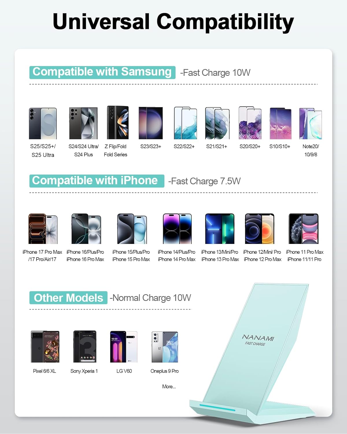 • Бързо зареждане и съвместими модели: Бързото безжично индукционно зарядно устройство NANAMI ви позволява да зареждате устройствата си с 40% по-бързо със стандарта за бързо безжично зареждане, съвместимо със Samsung Galaxy S25/S25 Ultra/S25 Plus/S24/S24 Ultra/S24 Plus/S23/S23 Ultra/S23 Plus/S22/S22 Ultra/S22+/S2221/S21+/S21 Ultra/S20/S20 fe/S20+/S10/S10+/S9/S9+/S8/S7/Note 20/10. Освен това е съвместимо с всички Qi-съвместими устройства със стандартна скорост на зареждане, като iPhone 17/17Pro/17 Pro Max/17 Air/16/16. Pro/16 Pro Max/16 Plus/15/15 Pro/15 Pro Max/15 Plus/14/14 Pro/14 Pro Max/13/13 Pro/13 Pro Max/12/12 Pro/12 Pro Max/11/11 Pro/11 Pro Max/XS/XS Max/XR/X/8 Plus/8; Google Pixel 8/8 Pro/7 Pro/7/6/6 Pro; LG