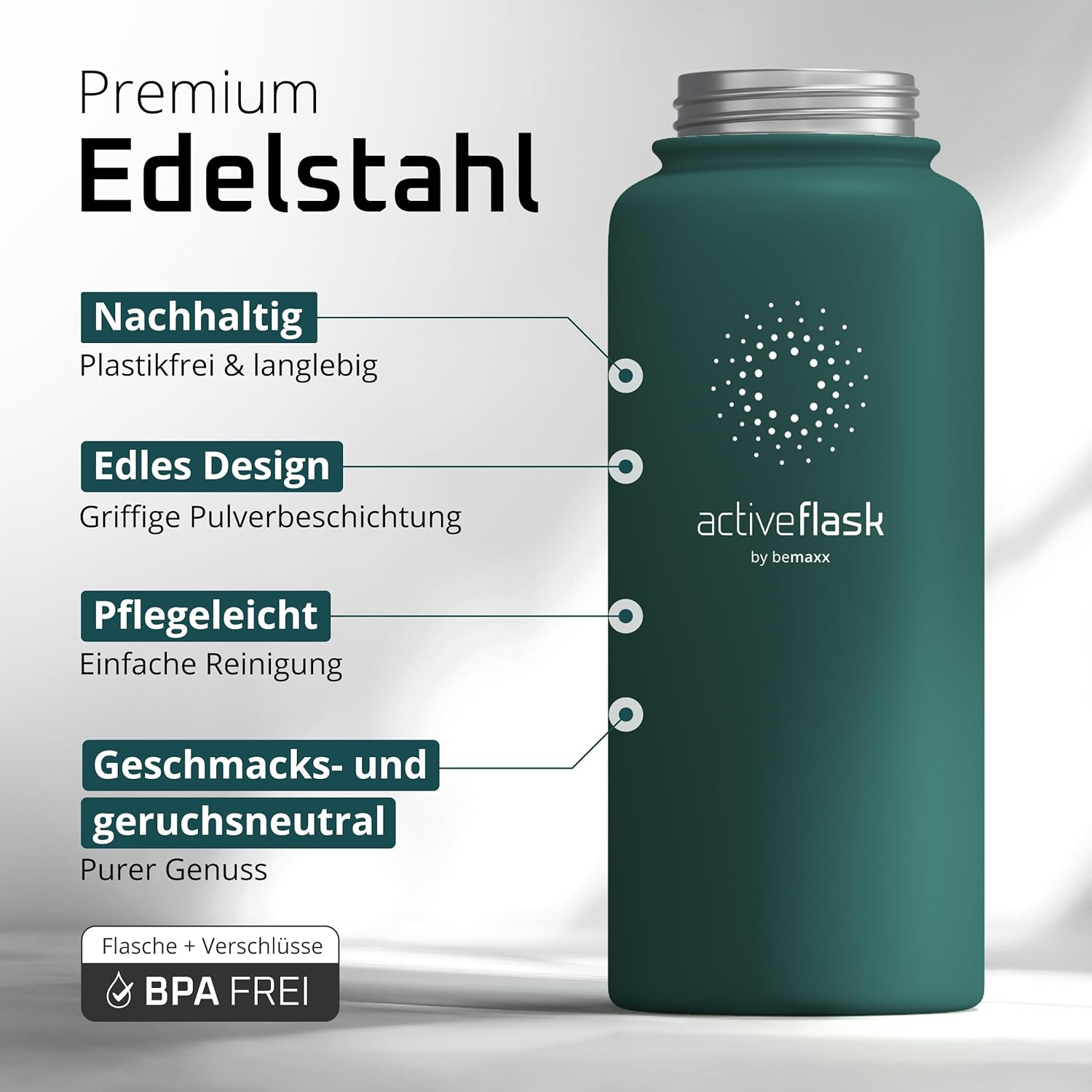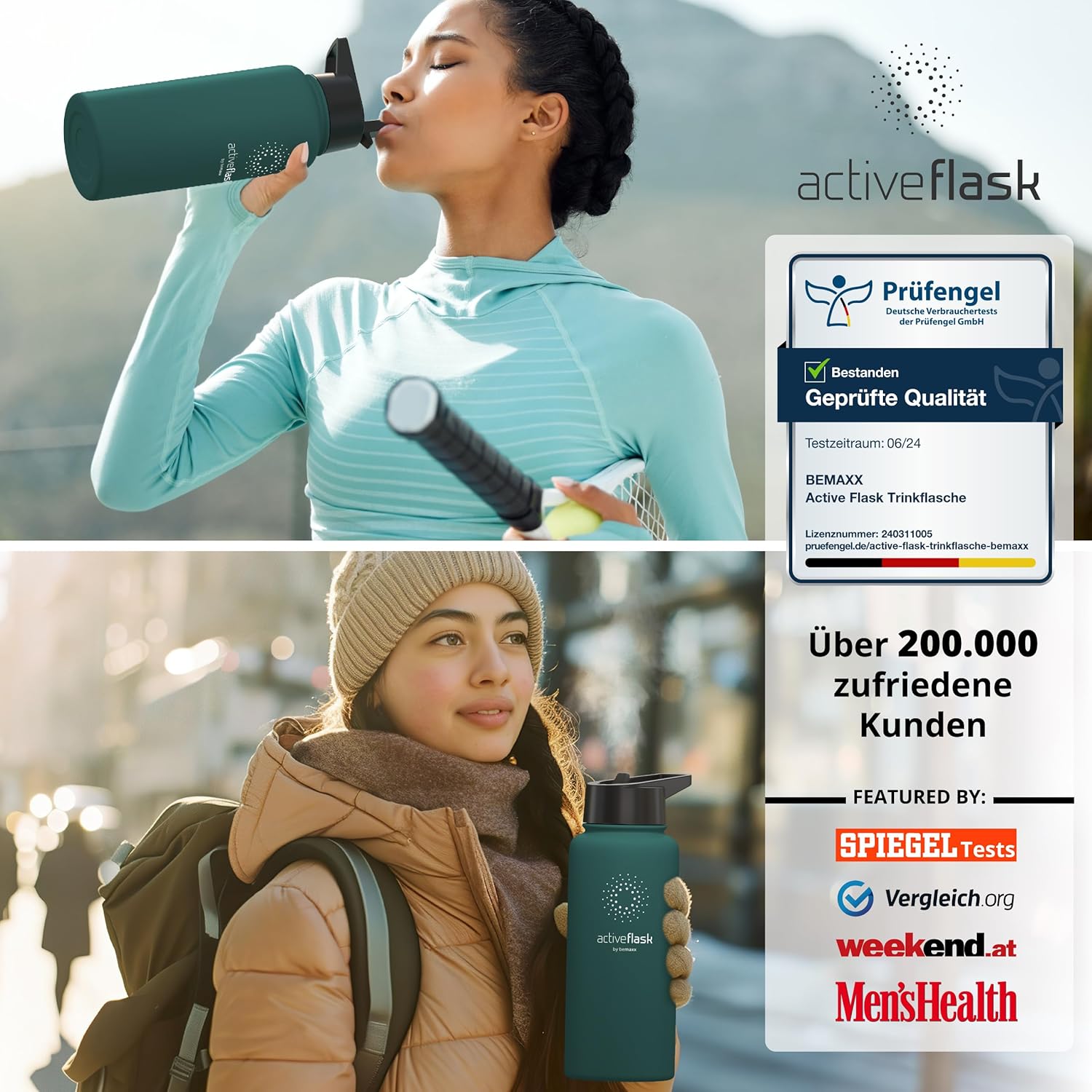 • 100% неръждаема стомана | 100% без BPA (бисфенол А) – Висококачествената полирана неръждаема стомана 18/8 не абсорбира миризми или вкусове. Сертификатите от FDA (Агенция по храните и лекарствата на САЩ) и LFGB (Тестване за контакт с храни) гарантират, че съставът, миризмата и/или вкусът на вашите напитки няма да бъдат засегнати по никакъв начин. Всички капачки на бутилки не съдържат бисфенол А и фталати, което е вредно за вашето здраве. За модели с прахово покритие и уплътнения препоръчваме ръчно миене.