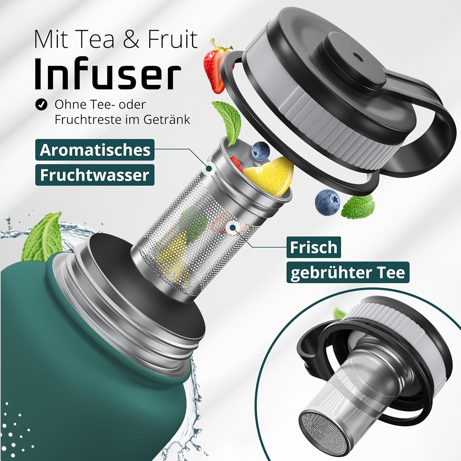• Премиум инфузер, комплект за чай и плодове – Превърнете бутилката си за пиене в инфузер за чай или плодове за нула време и се насладете на прясно приготвен чай или пресни плодови шприцове навсякъде – без остатъци от чай или плодове да попаднат в напитката ви.