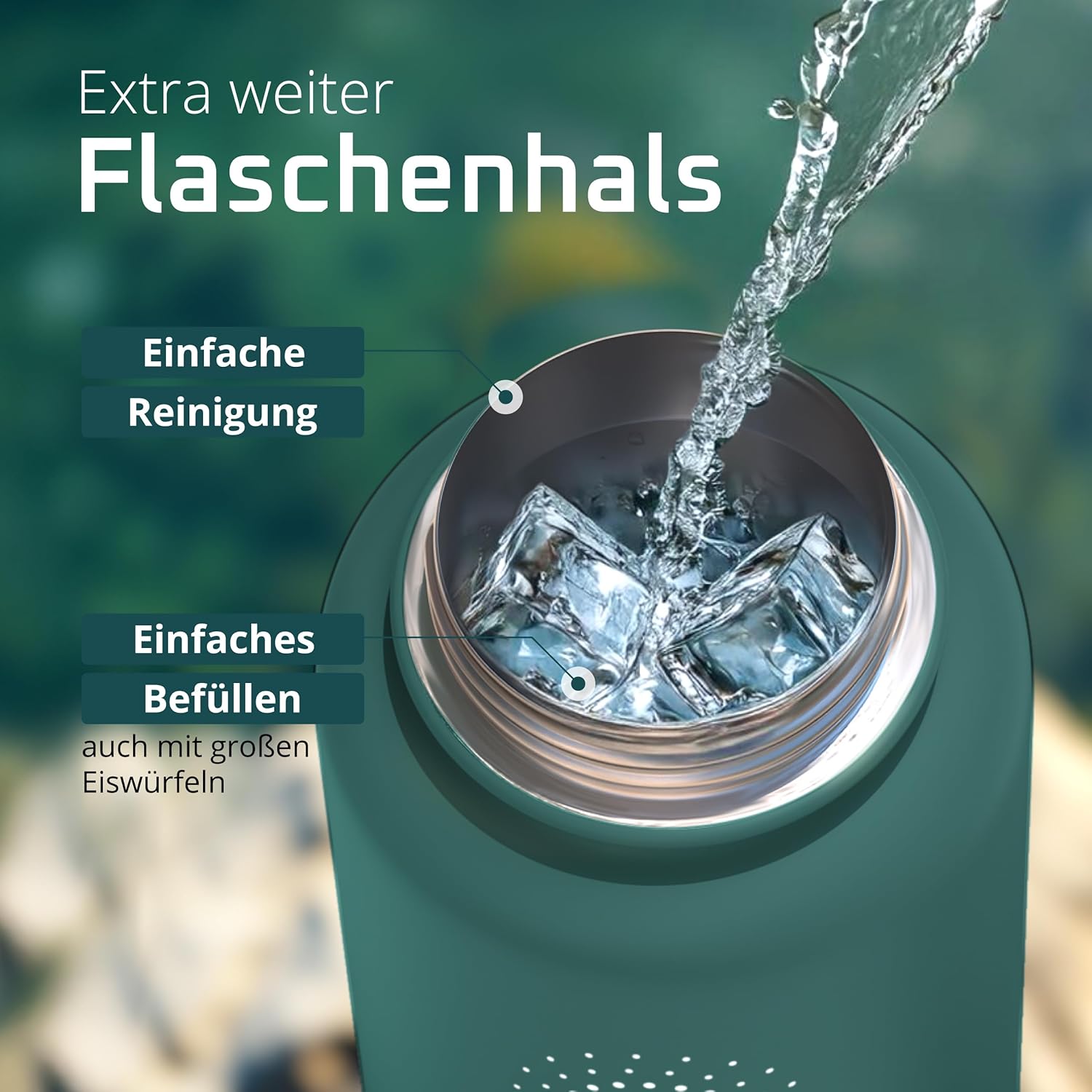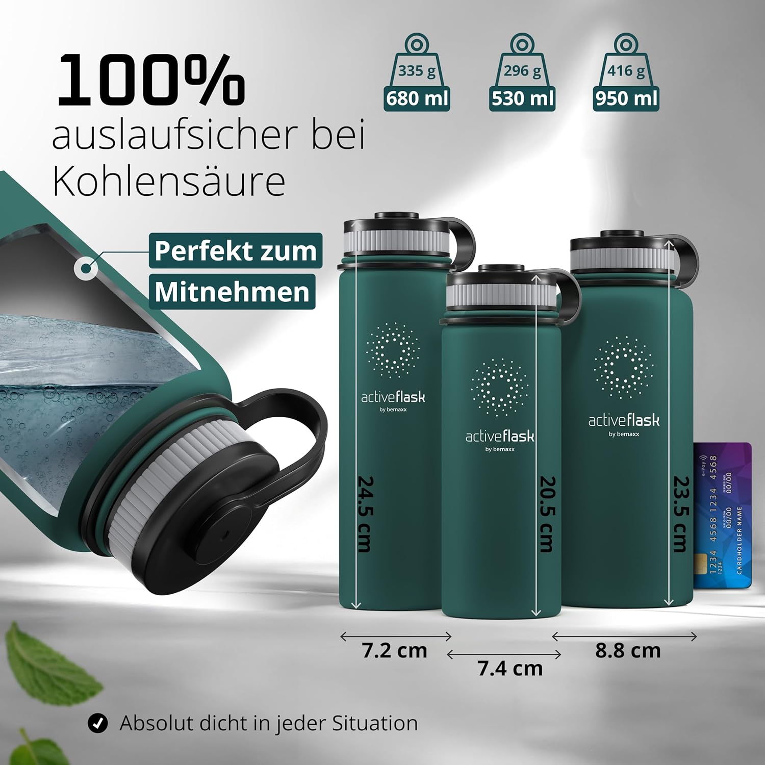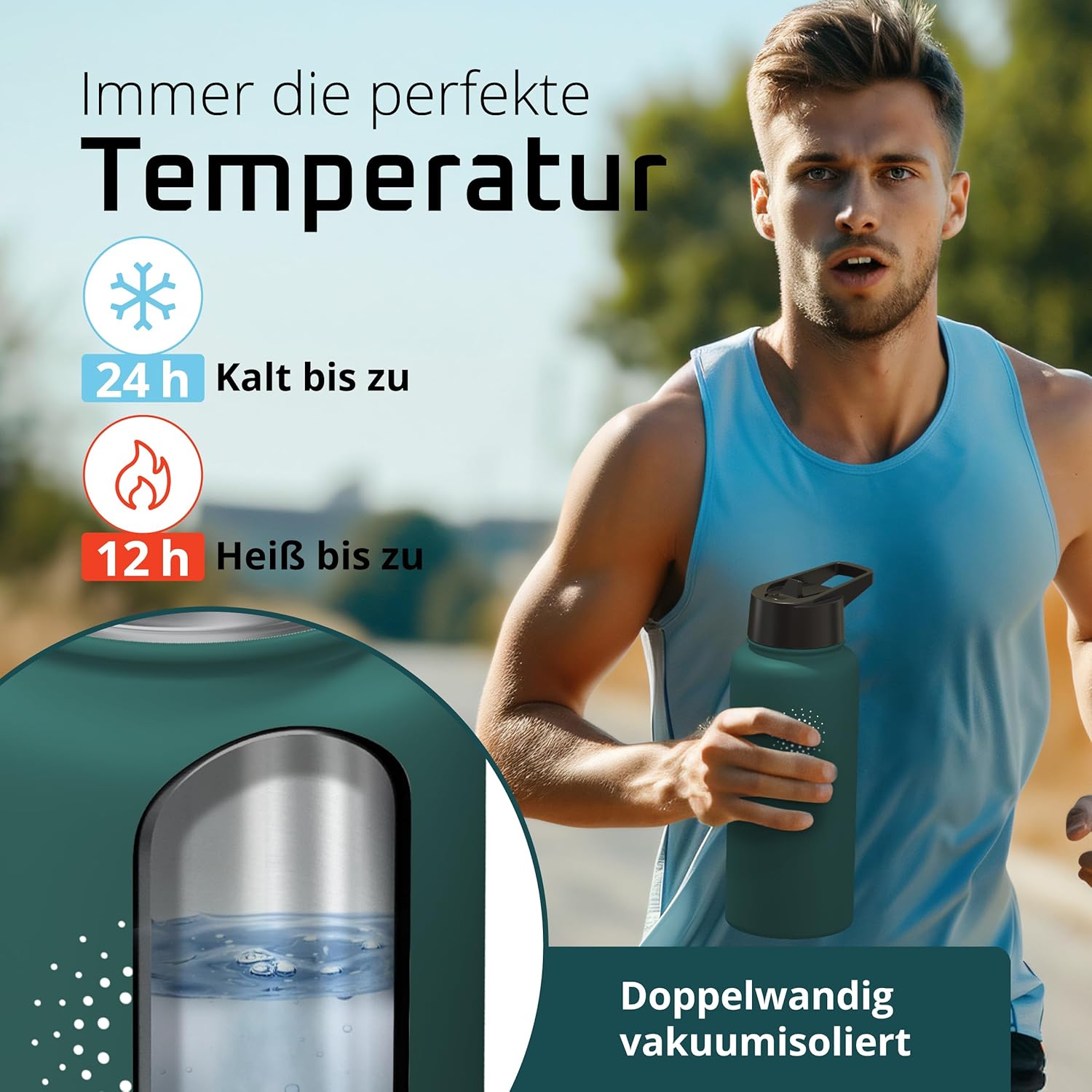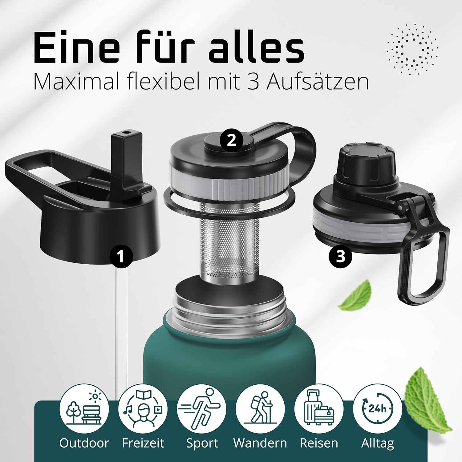 • Победител в теста: 12 часа топло и 25 часа студено | Вземете оригинала в обновен дизайн – двустенната вакуумно изолирана бутилка за пиене от неръждаема стомана с 3 различни капачки за ежедневна употреба, спорт и дейности на открито. Височина: 25 см, диаметър 9,3 см, обем: 950 мл. Тегло: 416 г. (*Настоящ победител в сравнението (категории „бутилки за пиене“ и „бутилки за пиене от неръждаема стомана“) atvergleich.org от 02/2017).