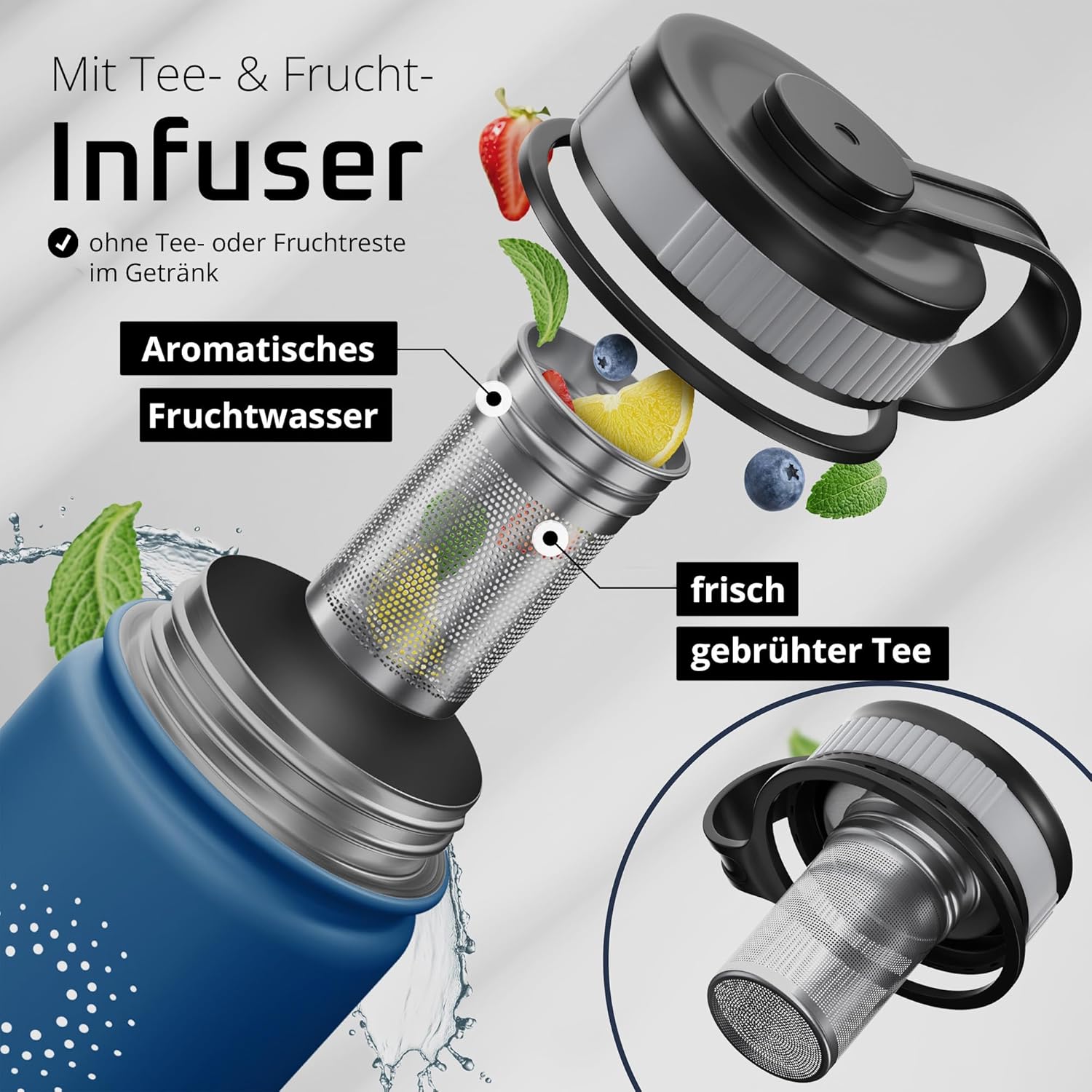 • Премиум инфузер, комплект за чай и плодове – Превърнете бутилката си за пиене в инфузер за чай или плодове за нула време и се насладете на прясно приготвен чай или пресни плодови шприцове навсякъде – без остатъци от чай или плодове да попаднат в напитката ви.