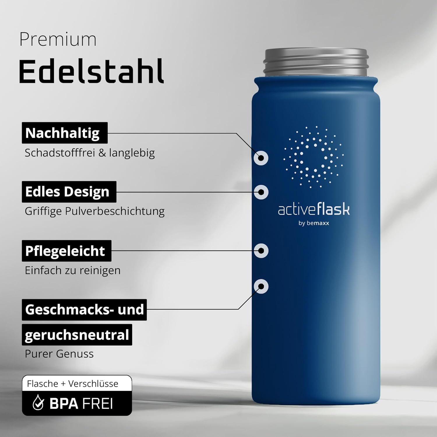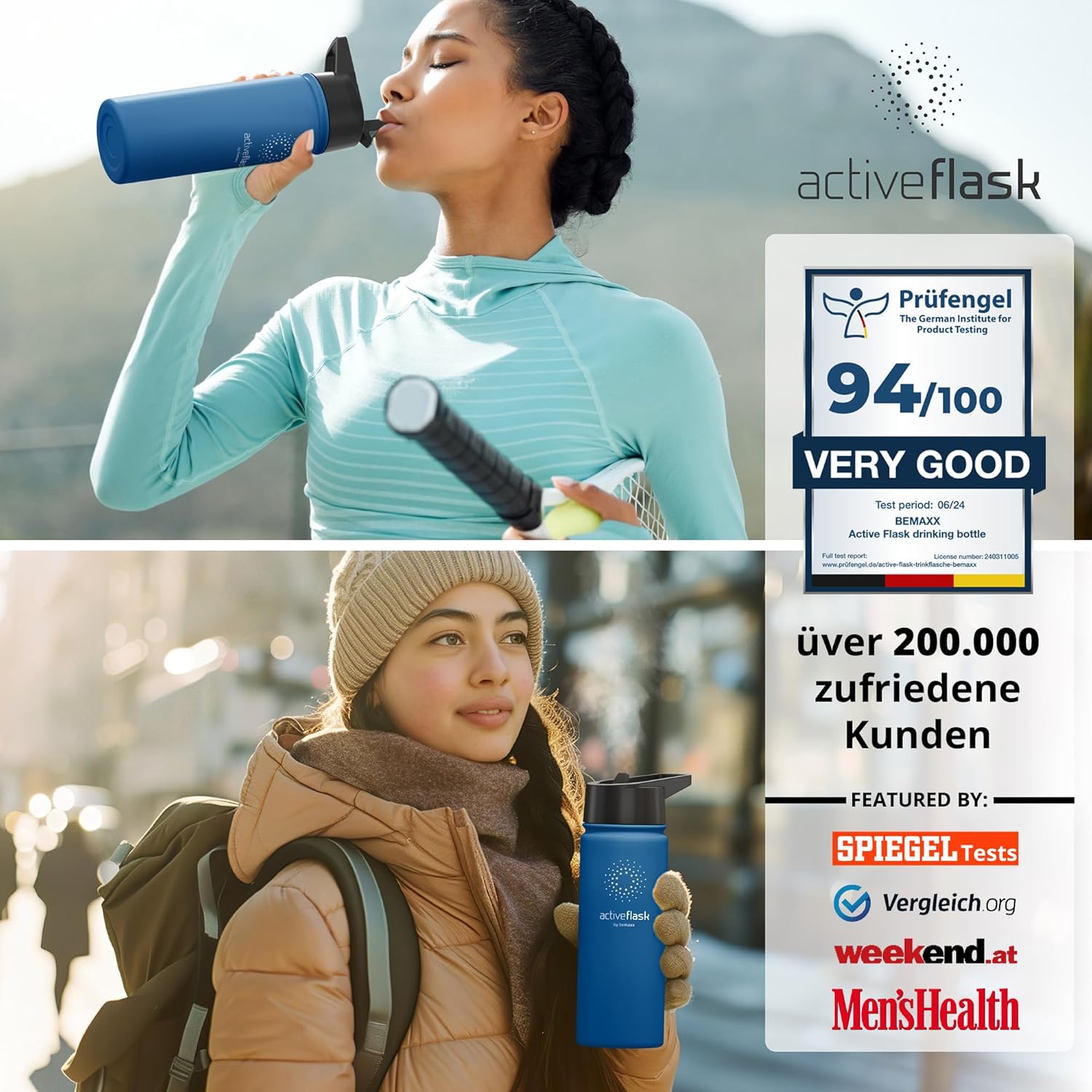 • 100% неръждаема стомана | 100% без BPA (бисфенол А) – Висококачествената полирана неръждаема стомана 18/8 не абсорбира миризми или вкусове. Сертификатите от FDA (Агенция по храните и лекарствата на САЩ) и LFGB (Тестване за контакт с храни) гарантират, че съставът, миризмата и/или вкусът на вашите напитки няма да бъдат засегнати по никакъв начин. Всички капачки на бутилки не съдържат бисфенол А и фталати, което е вредно за вашето здраве. За модели с прахово покритие и уплътнения препоръчваме ръчно миене.