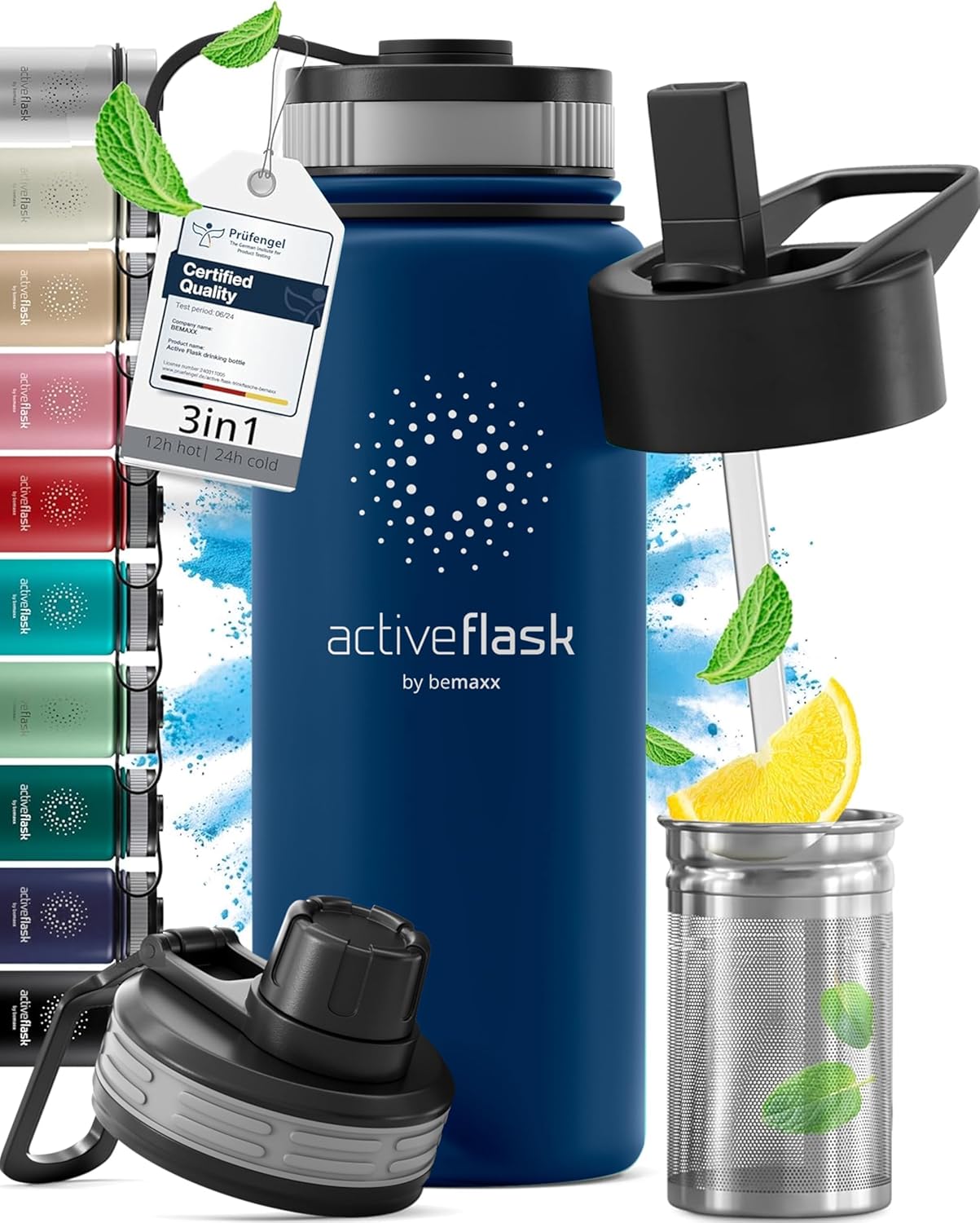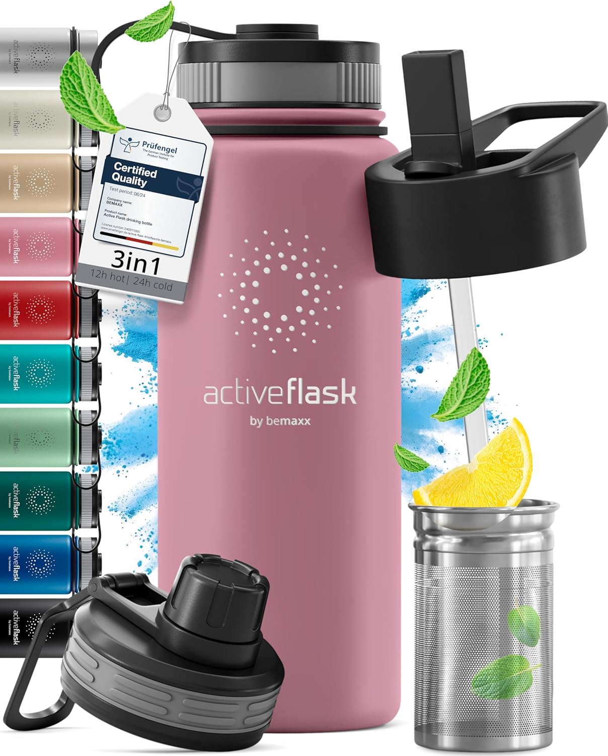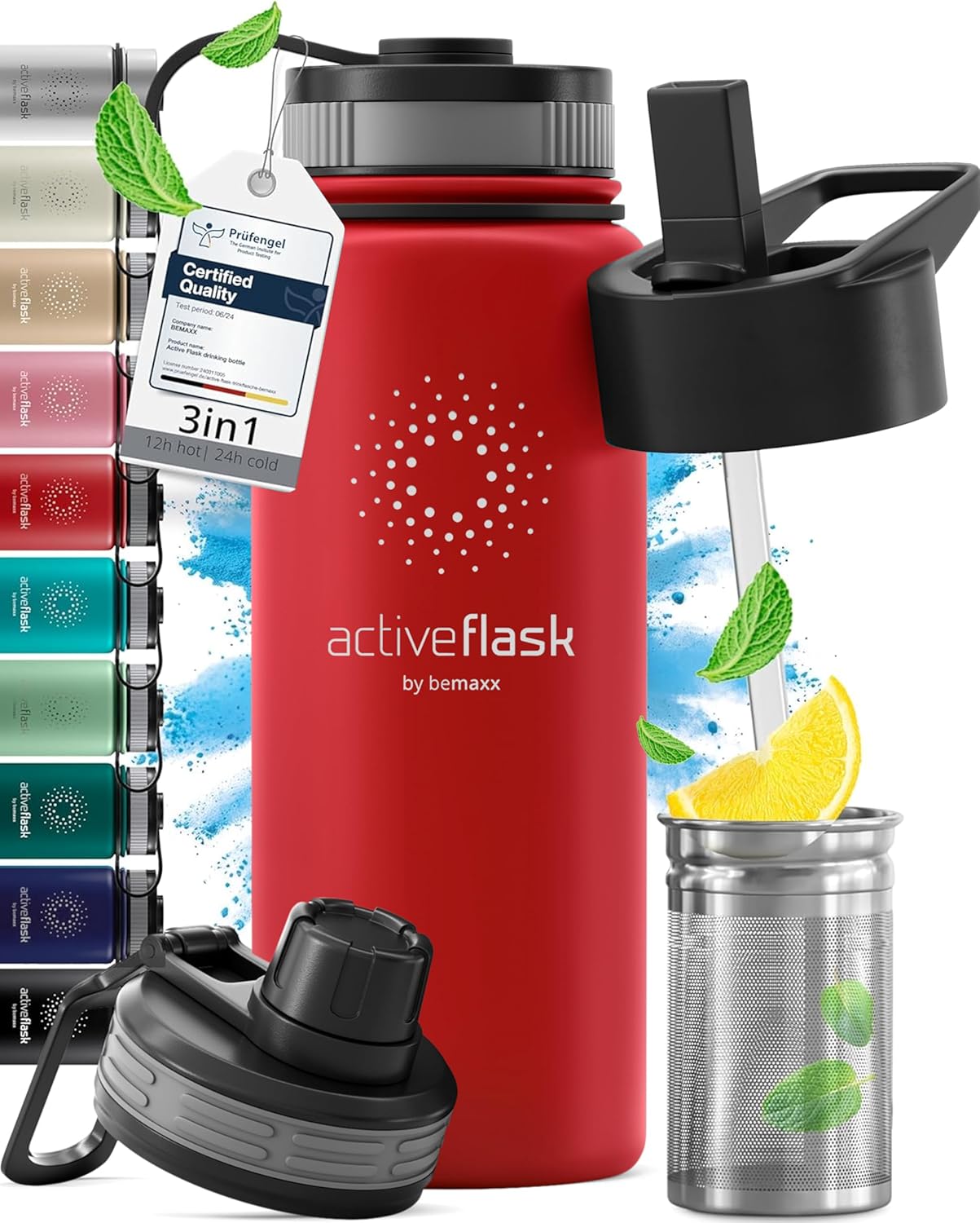 Бутилка за пиене BeMaxx Active Flask от неръждаема стомана + сламка (3 капака) без BPA (бисфенол А), непропусклива, за газирани напитки, термобутилка за велосипед, изолирана, спортна бутилка за вода, детски чай
