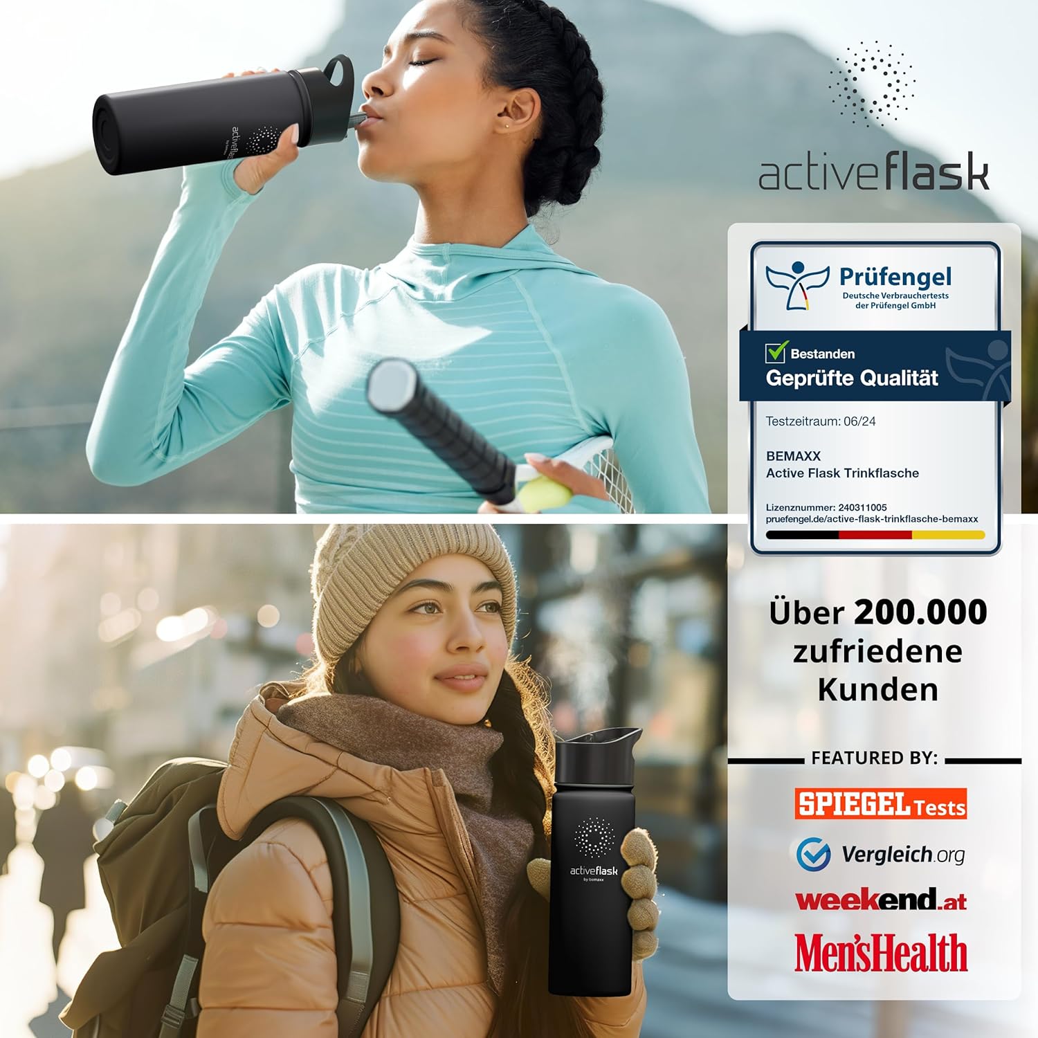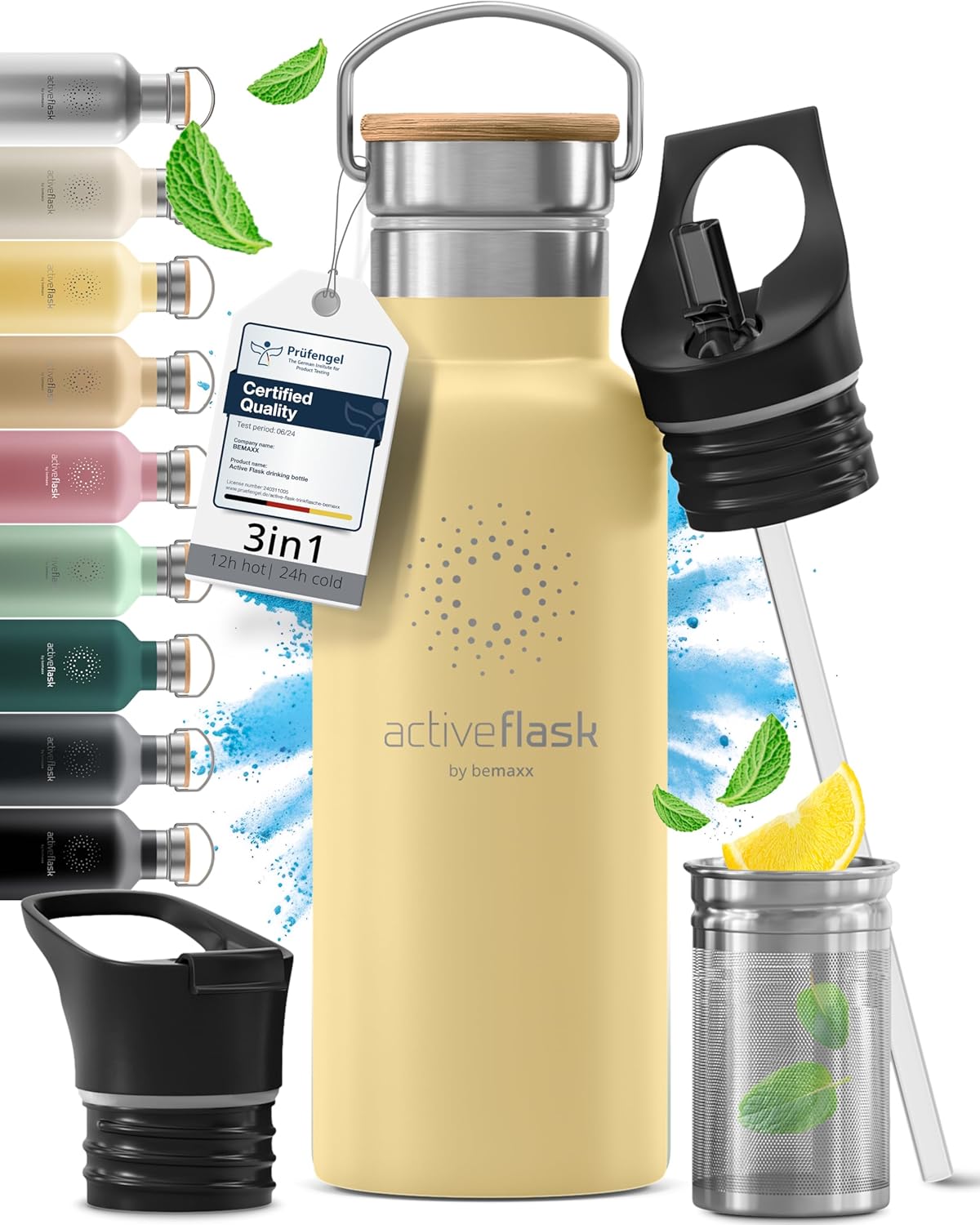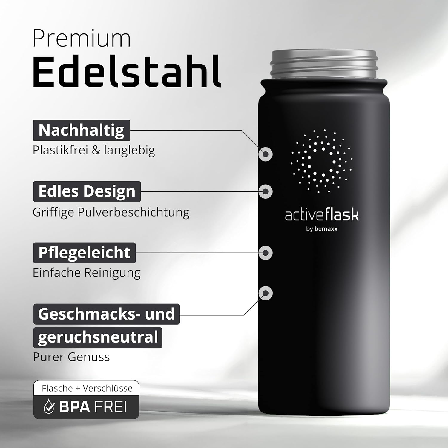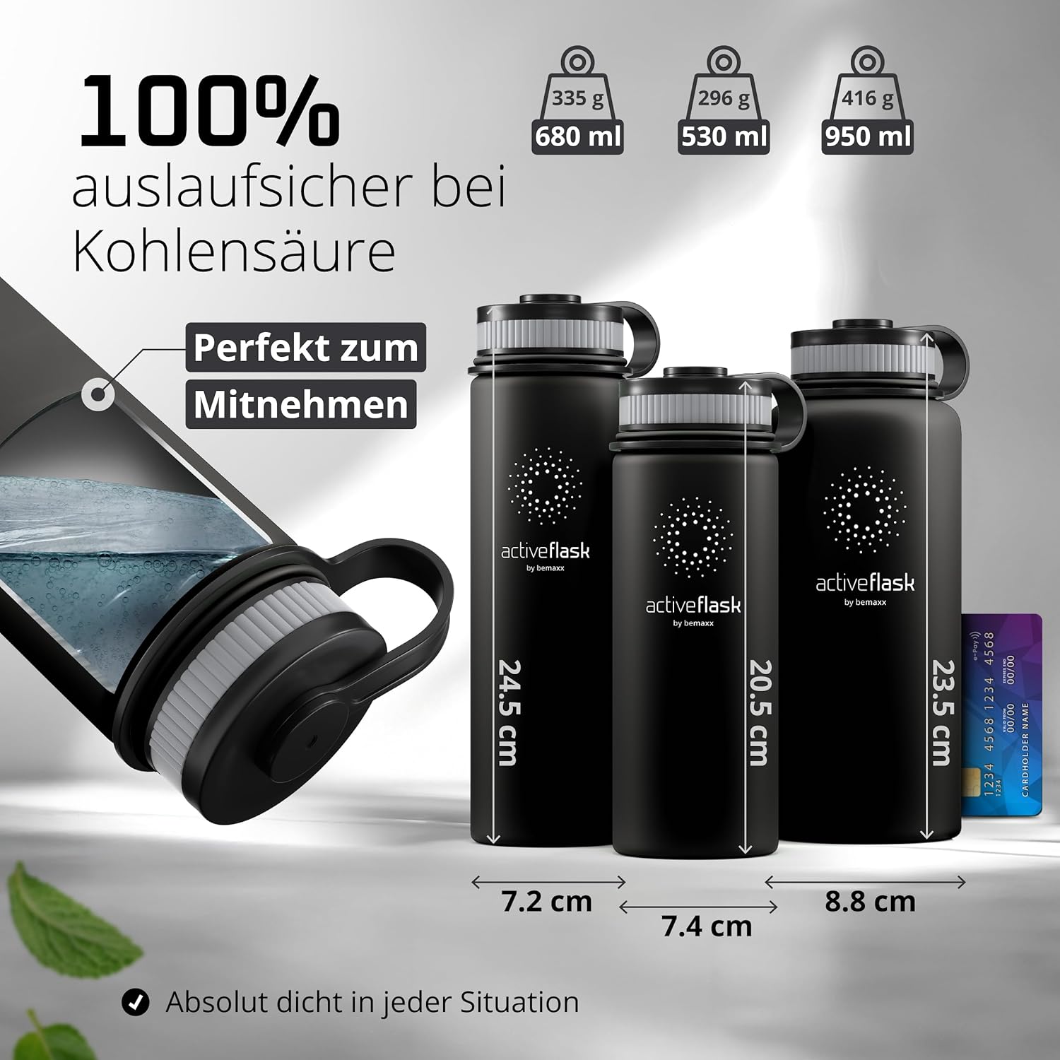 Бутилка за пиене BeMaxx Active Flask от неръждаема стомана + сламка (3 капака) без BPA (бисфенол А), непропусклива, за газирани напитки, термобутилка за велосипед, изолирана, спортна бутилка за вода, детски чай