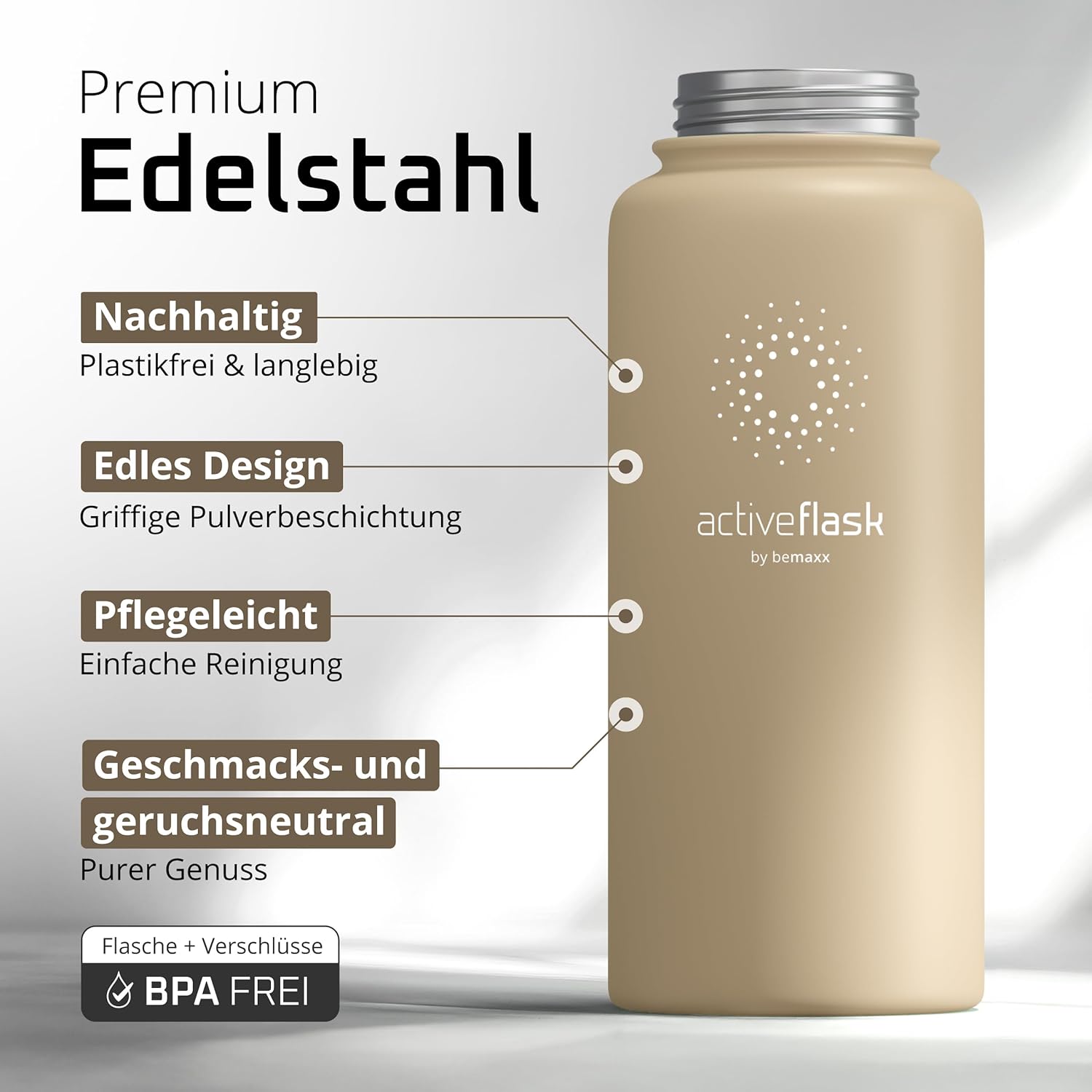 • 100% неръждаема стомана | 100% без BPA (бисфенол А) – Висококачествената полирана неръждаема стомана 18/8 не абсорбира миризми или вкусове. Сертификатите от FDA (Агенция по храните и лекарствата на САЩ) и LFGB (Тестване за контакт с храни) гарантират, че съставът, миризмата и/или вкусът на вашите напитки няма да бъдат засегнати по никакъв начин. Всички капачки на бутилки не съдържат бисфенол А и фталати, което е вредно за вашето здраве. За модели с прахово покритие и уплътнения препоръчваме ръчно миене.