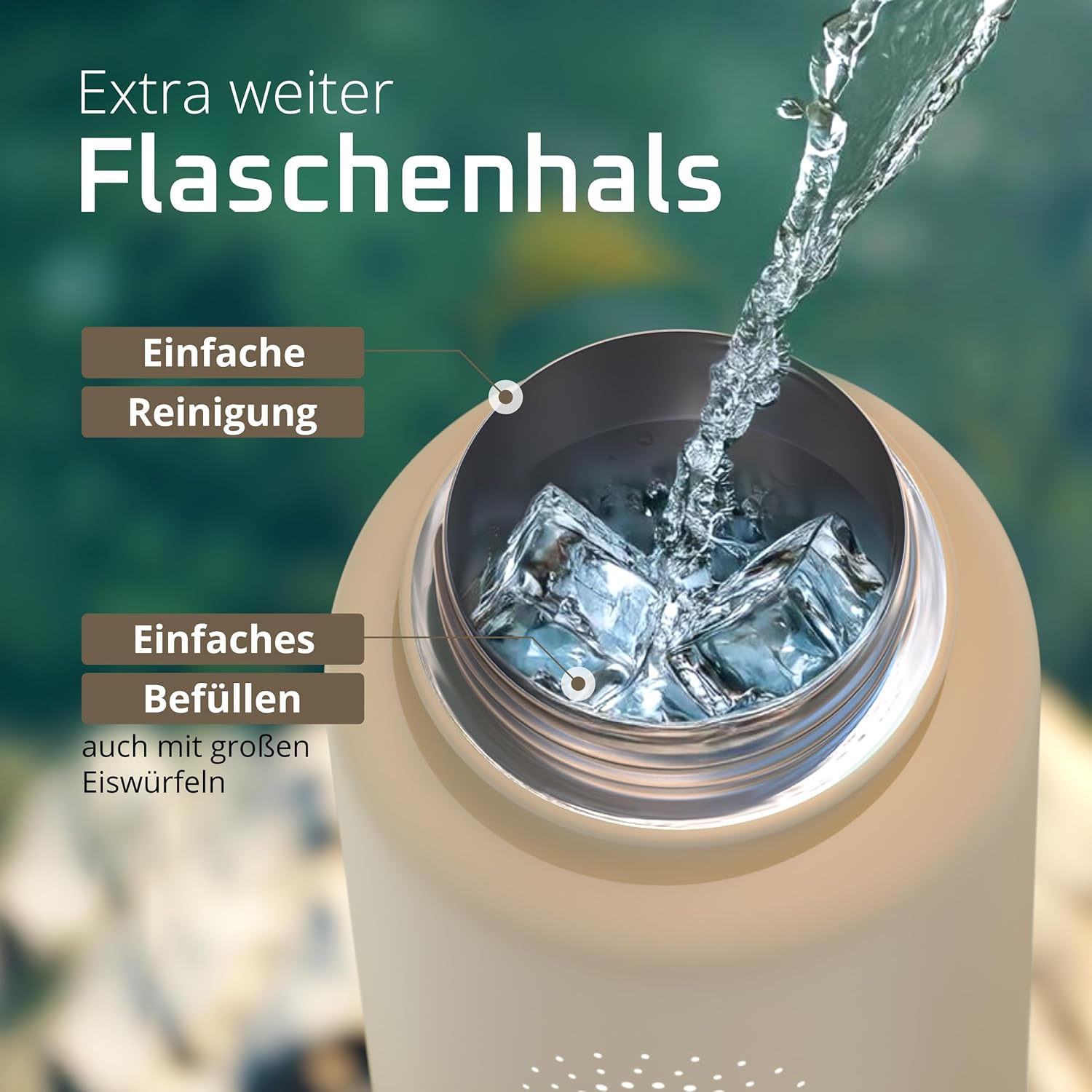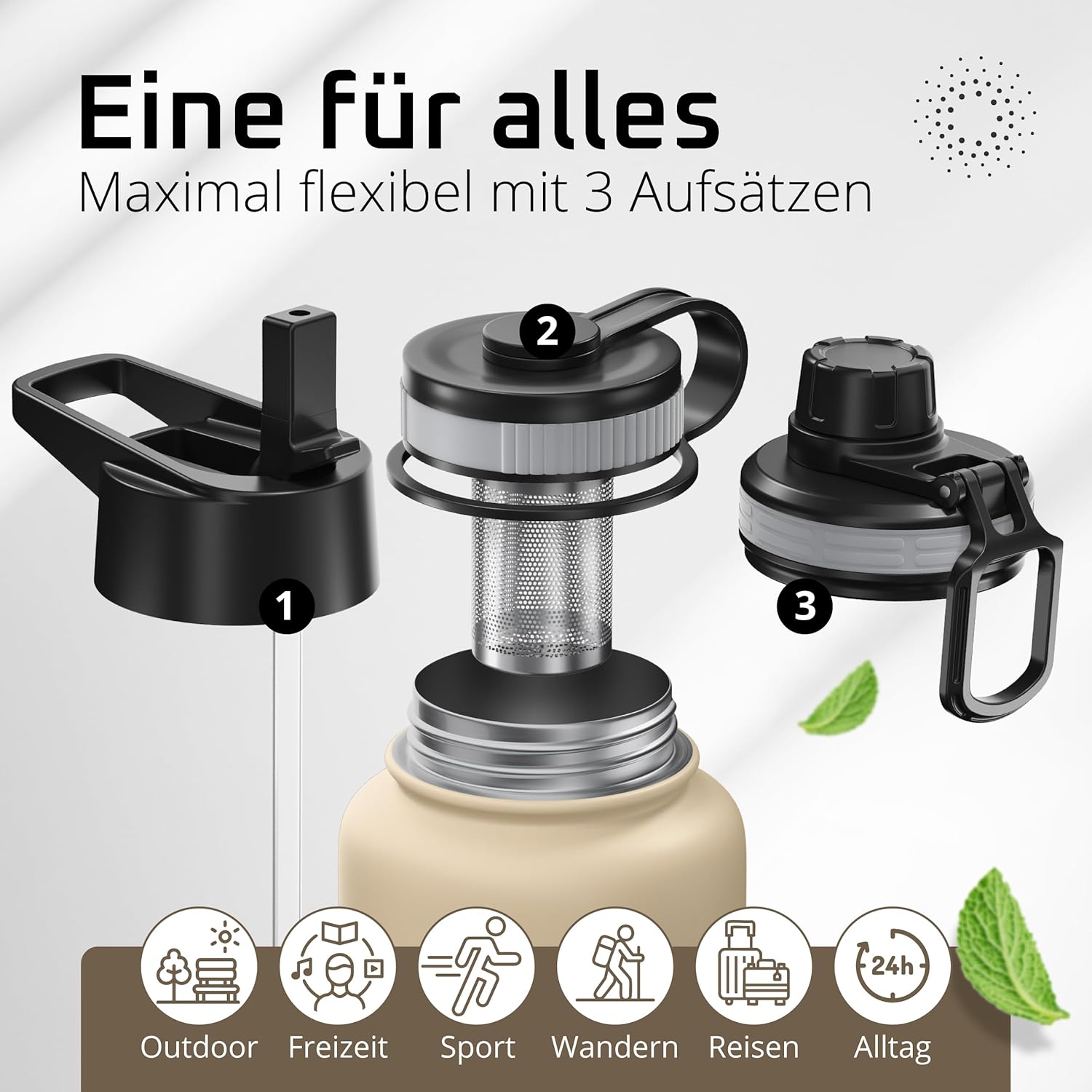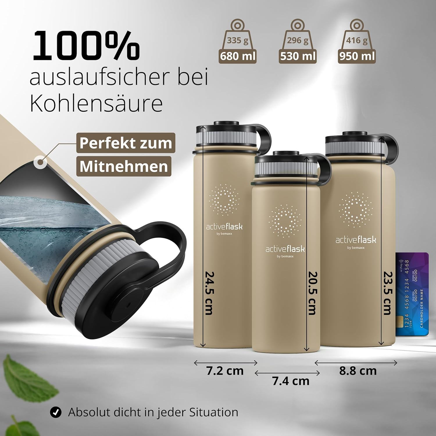 • Победител в теста: 12 часа топло и 25 часа студено | Вземете оригинала в обновен дизайн – двустенната вакуумно изолирана бутилка за пиене от неръждаема стомана с 3 различни капачки за ежедневна употреба, спорт и дейности на открито. Височина: 25 см, диаметър 9,3 см, обем: 950 мл. Тегло: 416 г. (*Настоящ победител в сравнението (категории „бутилки за пиене“ и „бутилки за пиене от неръждаема стомана“) atvergleich.org от 02/2017).