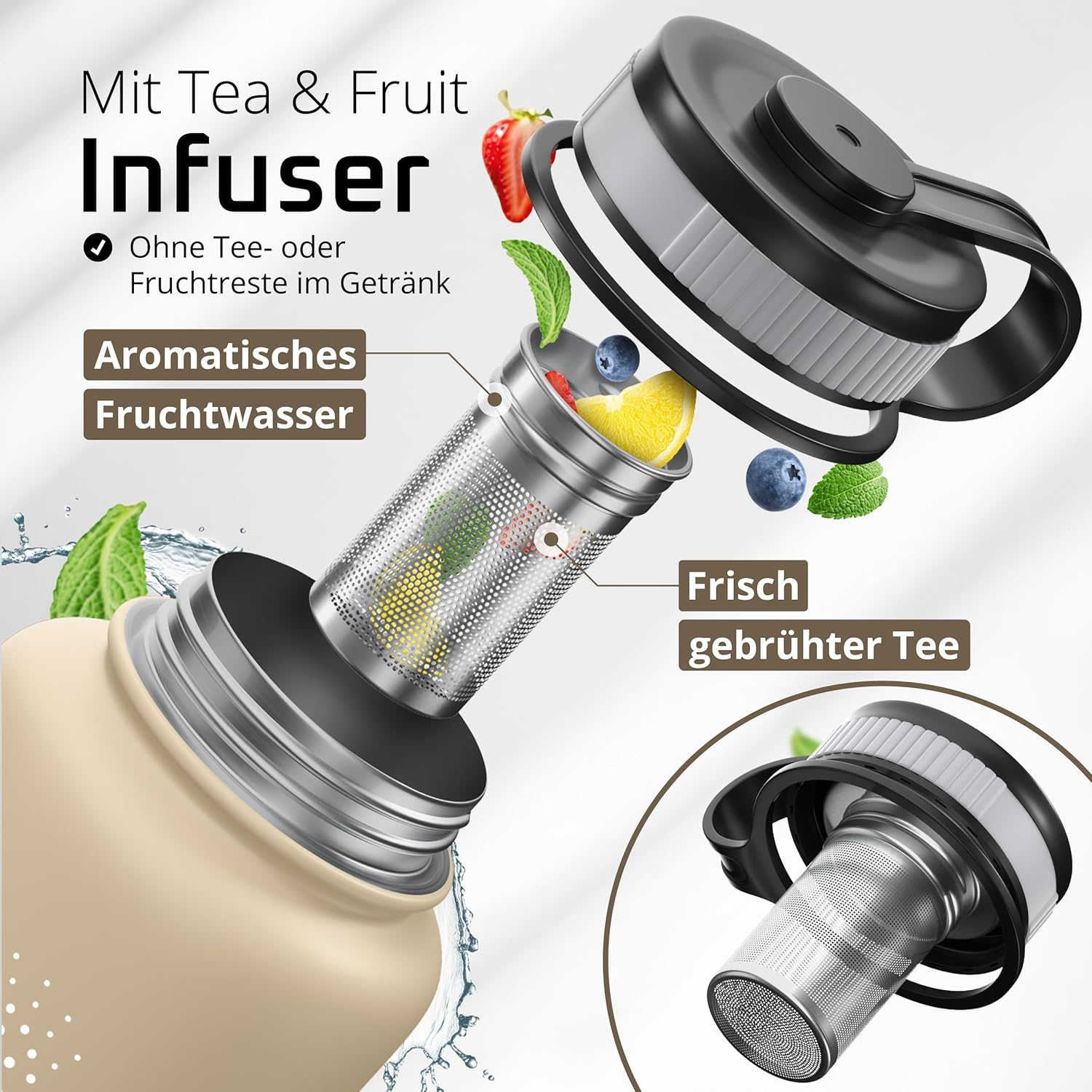 • Премиум инфузер, комплект за чай и плодове – Превърнете бутилката си за пиене в инфузер за чай или плодове за нула време и се насладете на прясно приготвен чай или пресни плодови шприцове навсякъде – без остатъци от чай или плодове да попаднат в напитката ви.